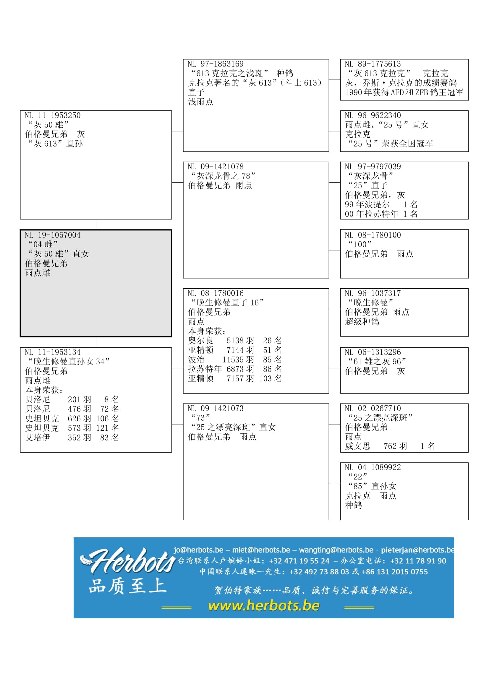 “613克拉克” (荣获:2,654羽1名 – 1,162羽1名 – 1,029羽1名 – 2,200羽1名 – 100% 詹森/克拉克) x “25之雨点雌” (“25”直女, “25”荣获:蒙特吕松国家赛 14,326羽1名 – 拉苏特年国家赛 7,555羽3名 – 艾佩纳 893羽3名 – 威文思 1,158羽4名) 回血直孙