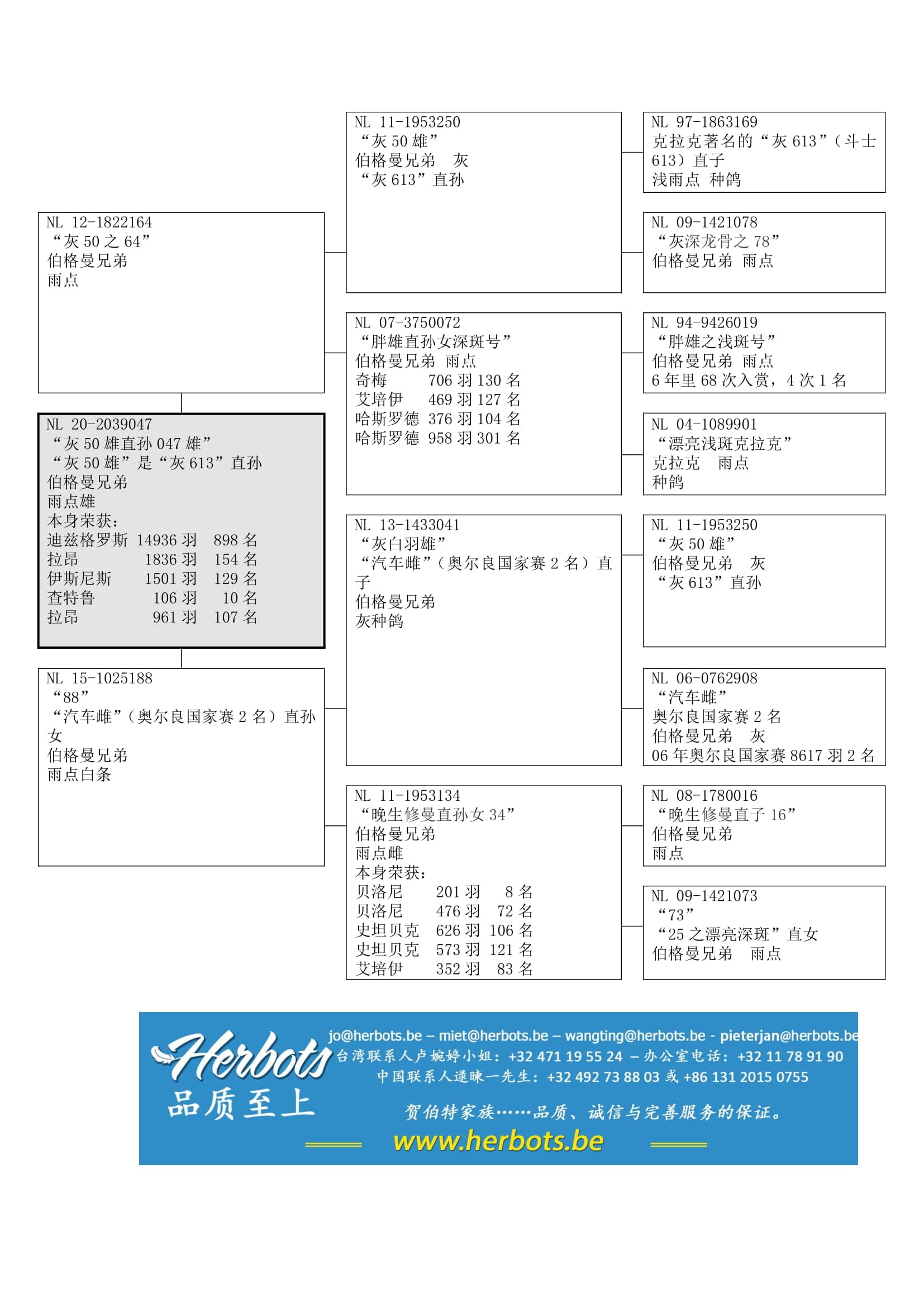 其祖辈“晚生修曼直子16”荣获:奥尔良 5,138羽26名– 亚精顿 7,144羽51名 – 波治11,535羽85名 – 拉苏特年 6,873羽86名