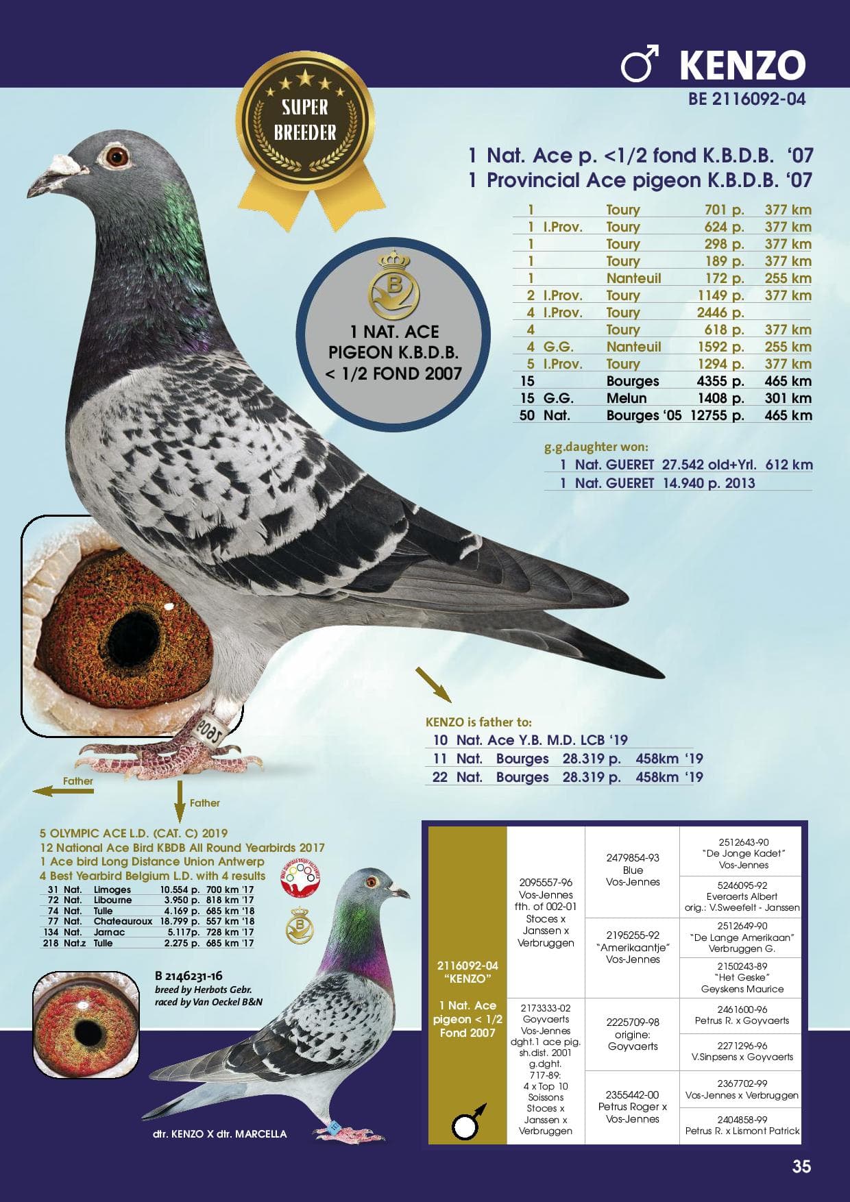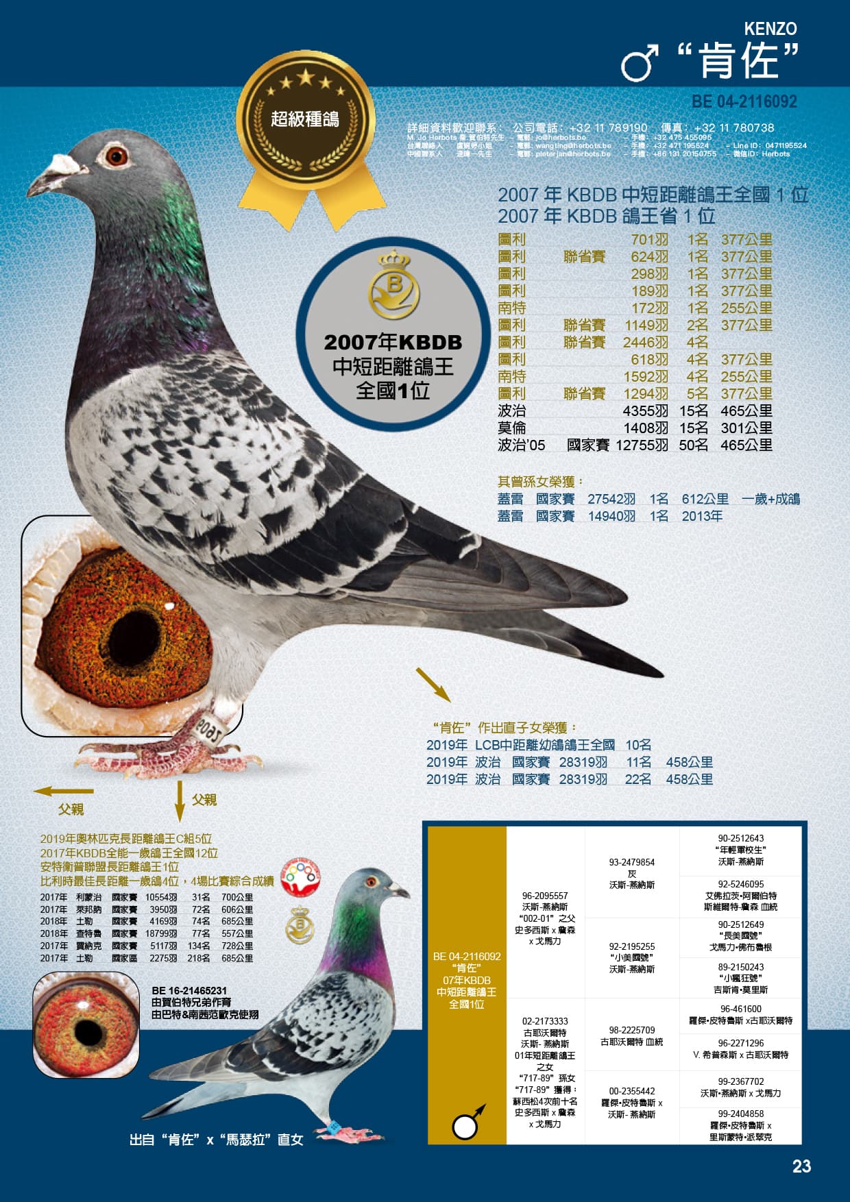 母亲:BE14-2313857 “肯佐”直女,“肯佐”荣获:2007年KBDB中距离鸽王全国1位 图利701羽1名377公里