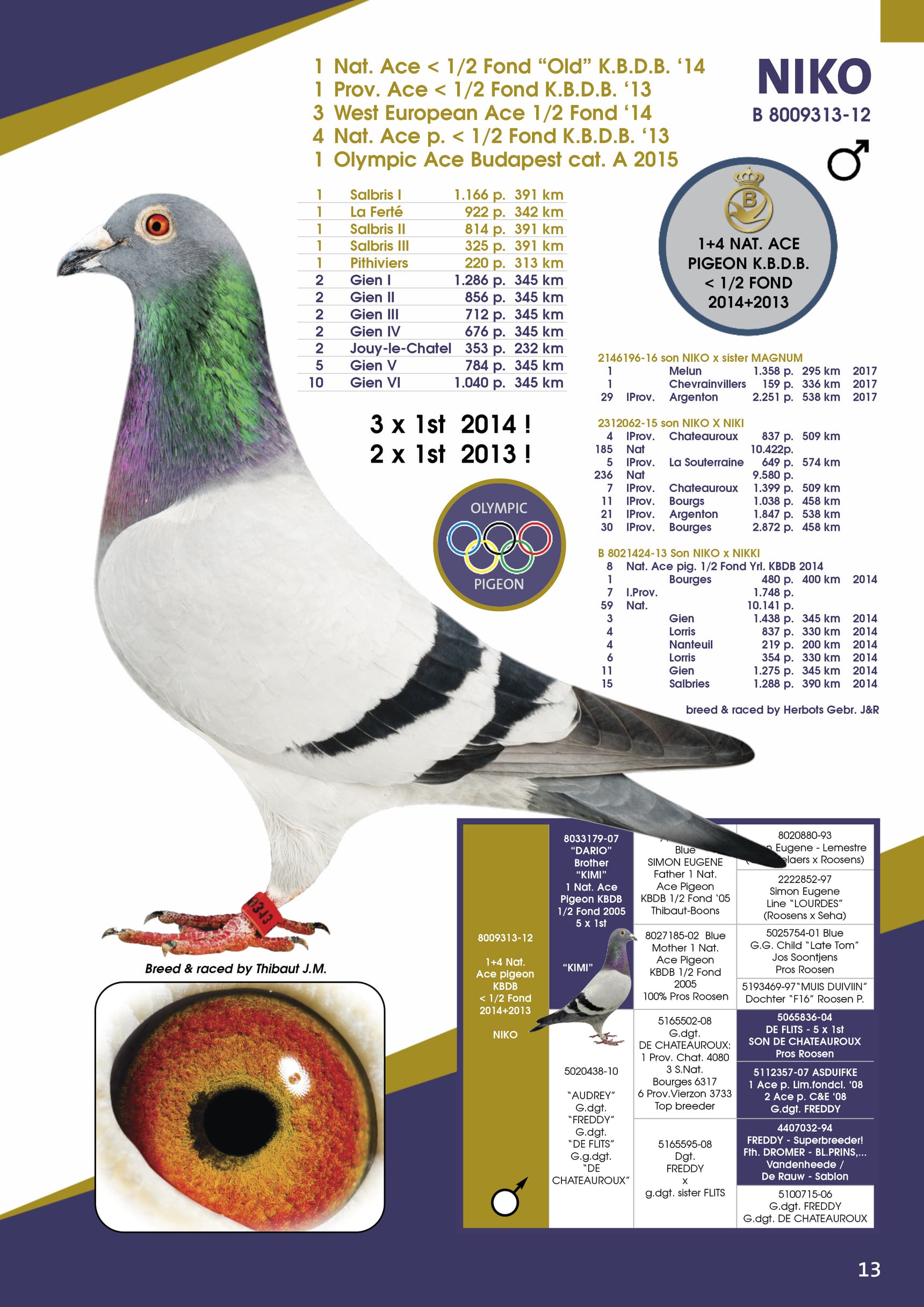 父亲:BE12-8009313 “尼寇”KBDB鸽王全国1位和4位-2014年KBDB中短距离老鸽王全国1位-2013年KBDB中短距离鸽王省1位