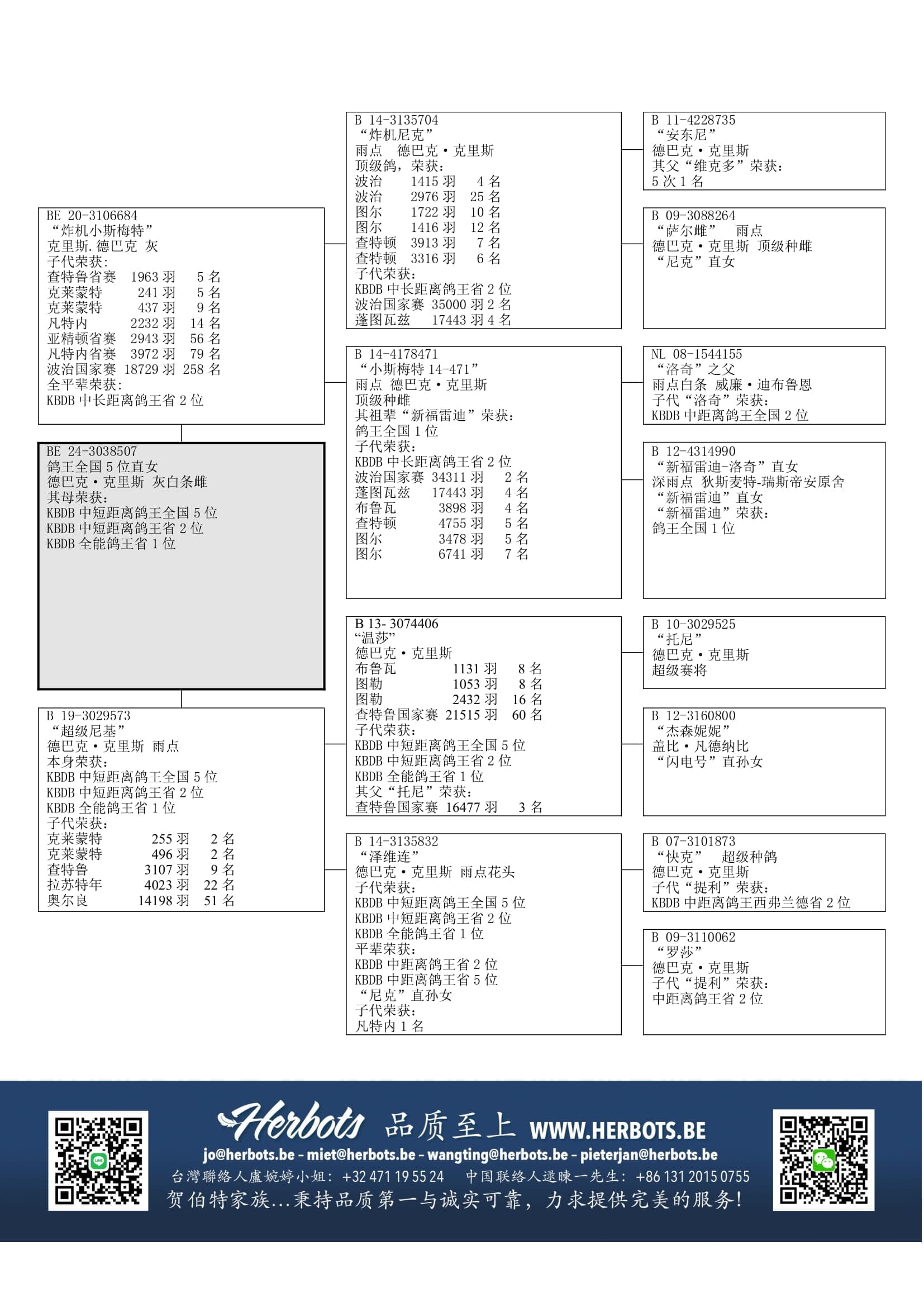 “温莎” (布鲁瓦 1,131羽8名 – 图勒2,432羽8名 – 查特鲁国家赛 21,515羽60名) x “泽维连”(KBDB鸽王省2位和5位之全姐妹) 直女