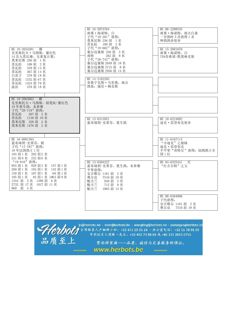 历经考验的年轻种雌子代BE 20-2044719 “灰雌 19号”获得:未来新顶级明星莫米尼斯 111公里 1476羽 2名苏瓦松 210公里 267羽 2名 1138羽10名莫米尼斯 111公里 302羽 16名半平辈 “快速银” 18年短距离鸽王1位半平辈 “超级银” 获得: 6 x次1名