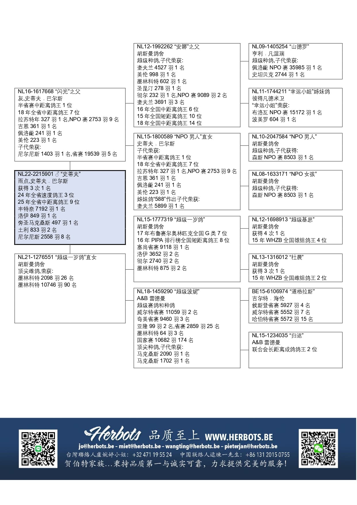 出自“319-15”,”超级一岁鸽”,胡斯曼鸽舍,荣获: 2017年布鲁赛尔奥林匹克全国G类7位 ,塞尚省赛 9.118羽1名–洛伊 3.652羽2名 –彻尔 2.740羽2名 –墨林科特 875羽2名 x “290-18”,”超级波妮” ,A & B 雷德曼,荣获威尔特省赛11.059羽2名–奇美省赛 9.460羽3名–亚隆省赛2.859羽25名