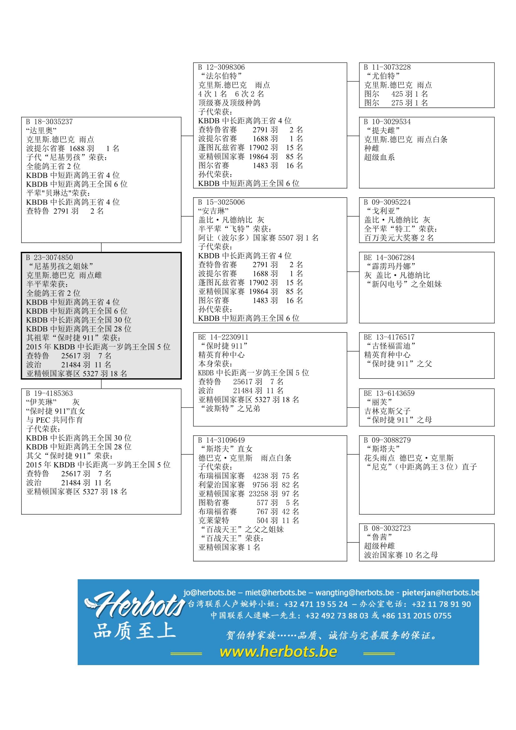 顶级全平辈代表:“贝琳达”(KBDB长距离幼鸽鸽王省4位) – “巴尔塔莎” (蓬图瓦兹 17,902羽15名) – “班代” – “柯文” (亚精顿国家赛 19,864羽85名)  - 等等