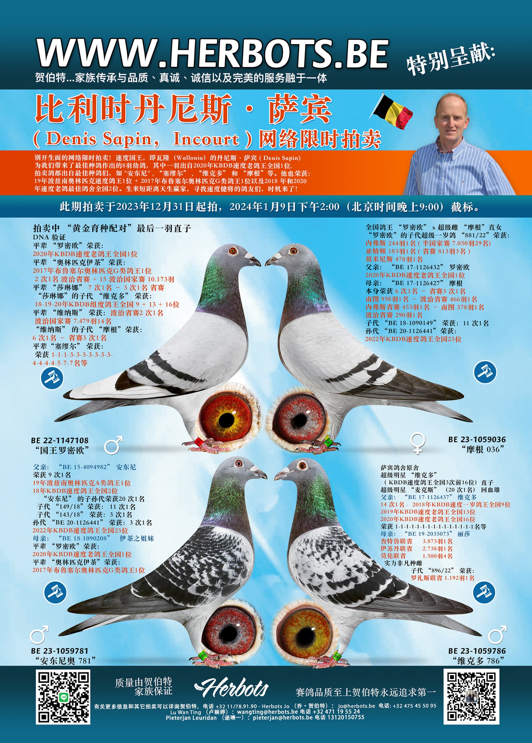别开生面的网络限时拍卖!速度国王,即瓦隆(Wallonia)的丹尼斯·萨宾 ( Denis Sapin) 为我们带来了最佳种鸽作出的8羽幼鸽,其中一羽出自2020年KBDB速度老鸽王全国1位, 拍卖鸽都出自最佳种鸽们,如 "安东尼" , “塞缪尔” , “维克多” 和 “摩根”等。他也荣获:19年波兹南奥林匹克速度鸽王1位 + 2017年布鲁塞尔奥林匹克G类鸽王1位以及2018 年和2020年速度老鸽最佳鸽舍全国2位。生来短距离天生赢家,寻找速度健将的鸽友们,时机来了!