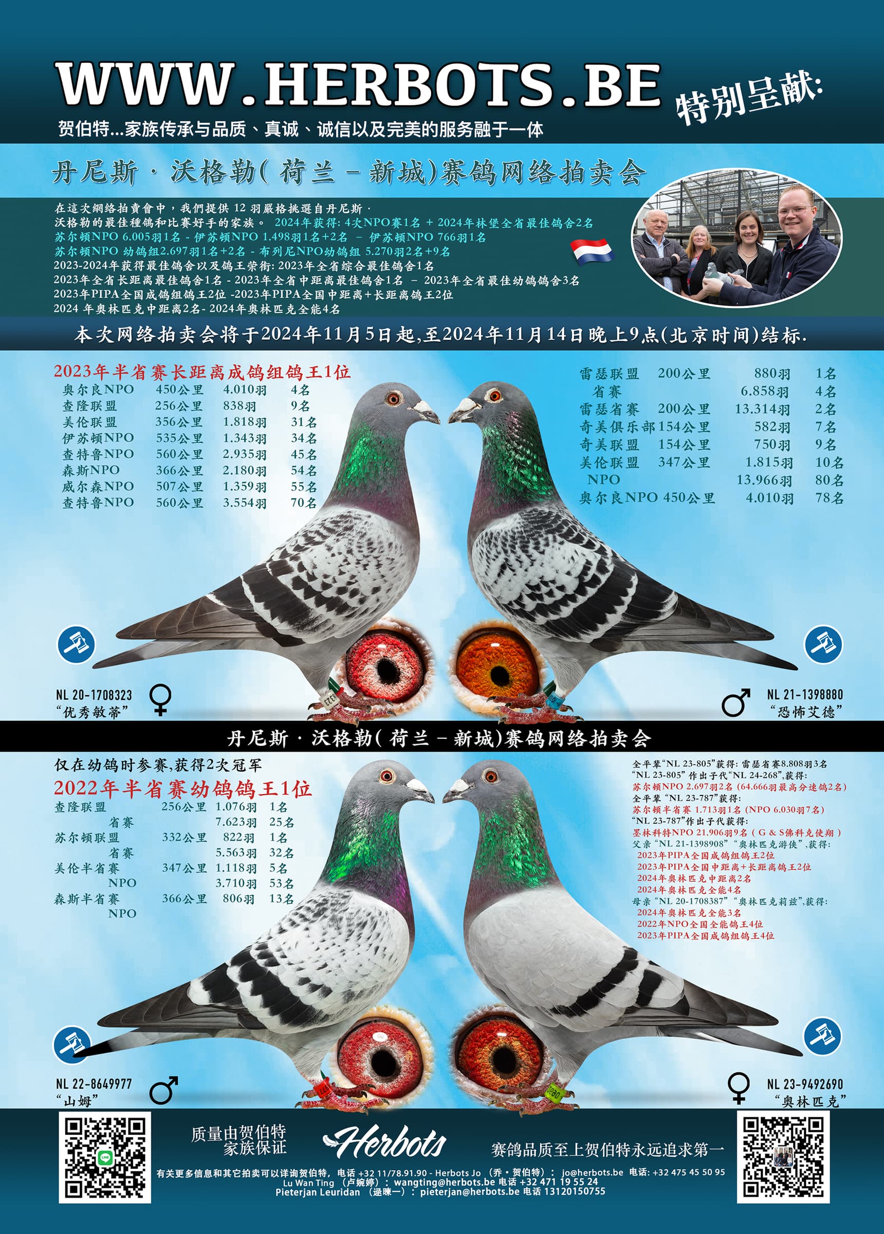 在这次线上拍卖中,我们精心挑选 12 只丹尼斯·福格利尔斯(Dennis Veugelers)最佳种鸽和同家族作出的鸽子。