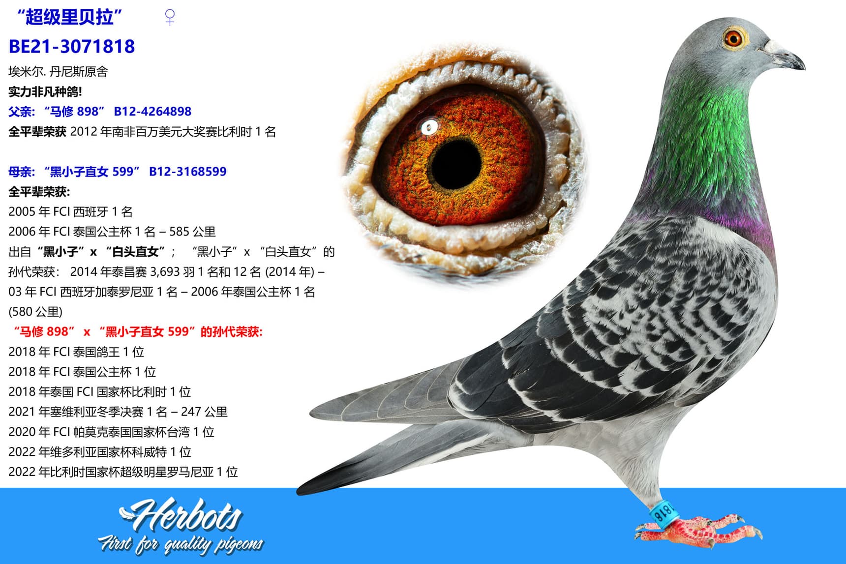 孙代荣获: 2014年泰昌赛3,693羽1名和12名 (2014年) – 03年FCI 西班牙加泰罗尼亚1名 – 2006年泰国公主杯1名(580公里)