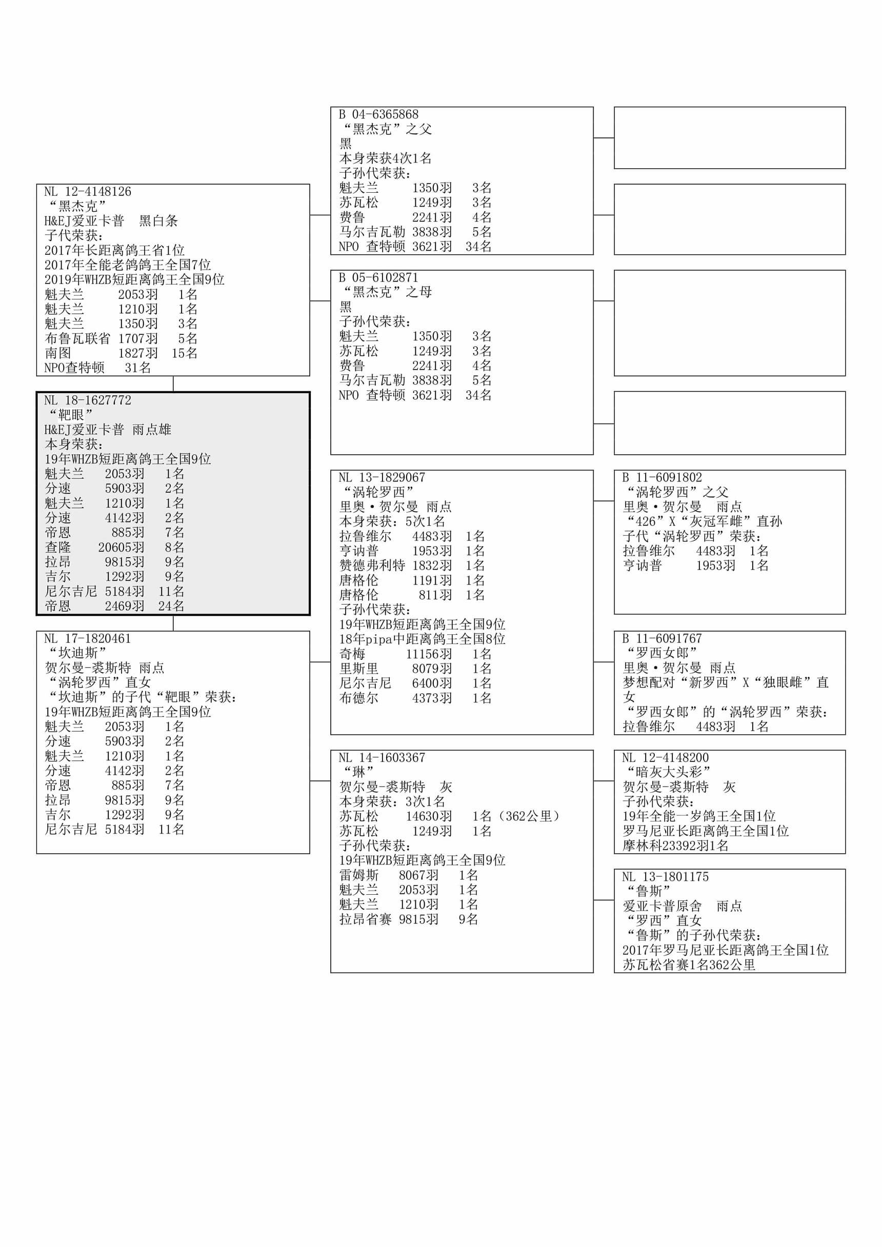 本身荣获:19年WHZB短距离鸽王全国9位魁夫兰 2053羽 1名分速 5903羽 2名魁夫兰 1210羽 1名分速 4152羽 2名帝恩 885羽 7名查隆 20605羽 8名拉昂 9815羽 9名吉尔 1292羽 9名尼尔吉尼 5184羽 11名“涡轮罗西”直孙