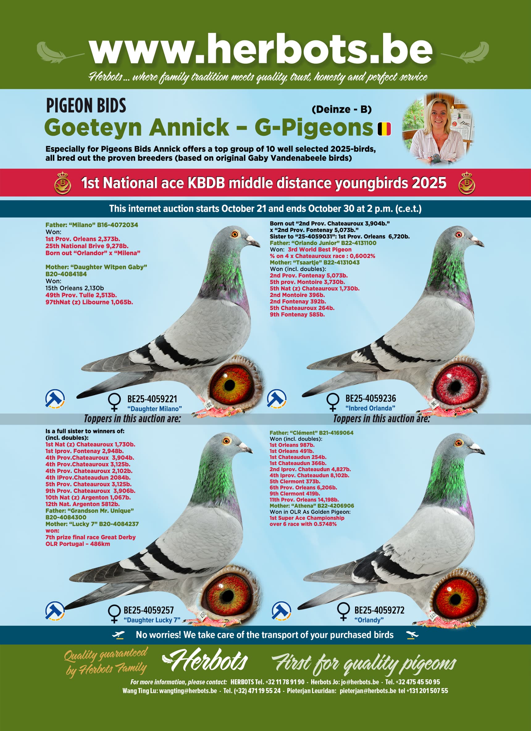 Especially for Pigeon Bids she selected direct children out her best breeders and then we talk about "Milano", "Orlando Junior", "Tsaartje", Ruud", "As Golden Lucky", Lucky 7" and so on
