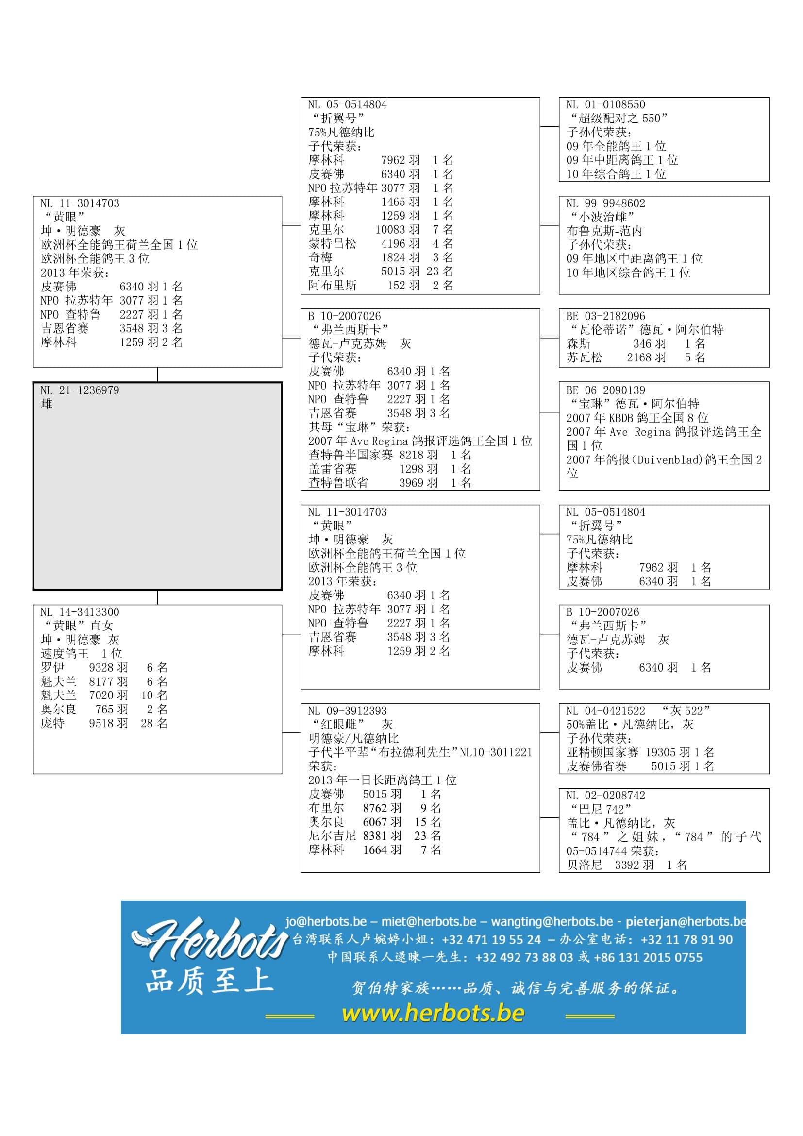 作出多代顶级鸽,在各种类型的比赛中获得高位翔绩,如2023年阿让国际赛1名等;在世界各地获得成千上万次冠军。