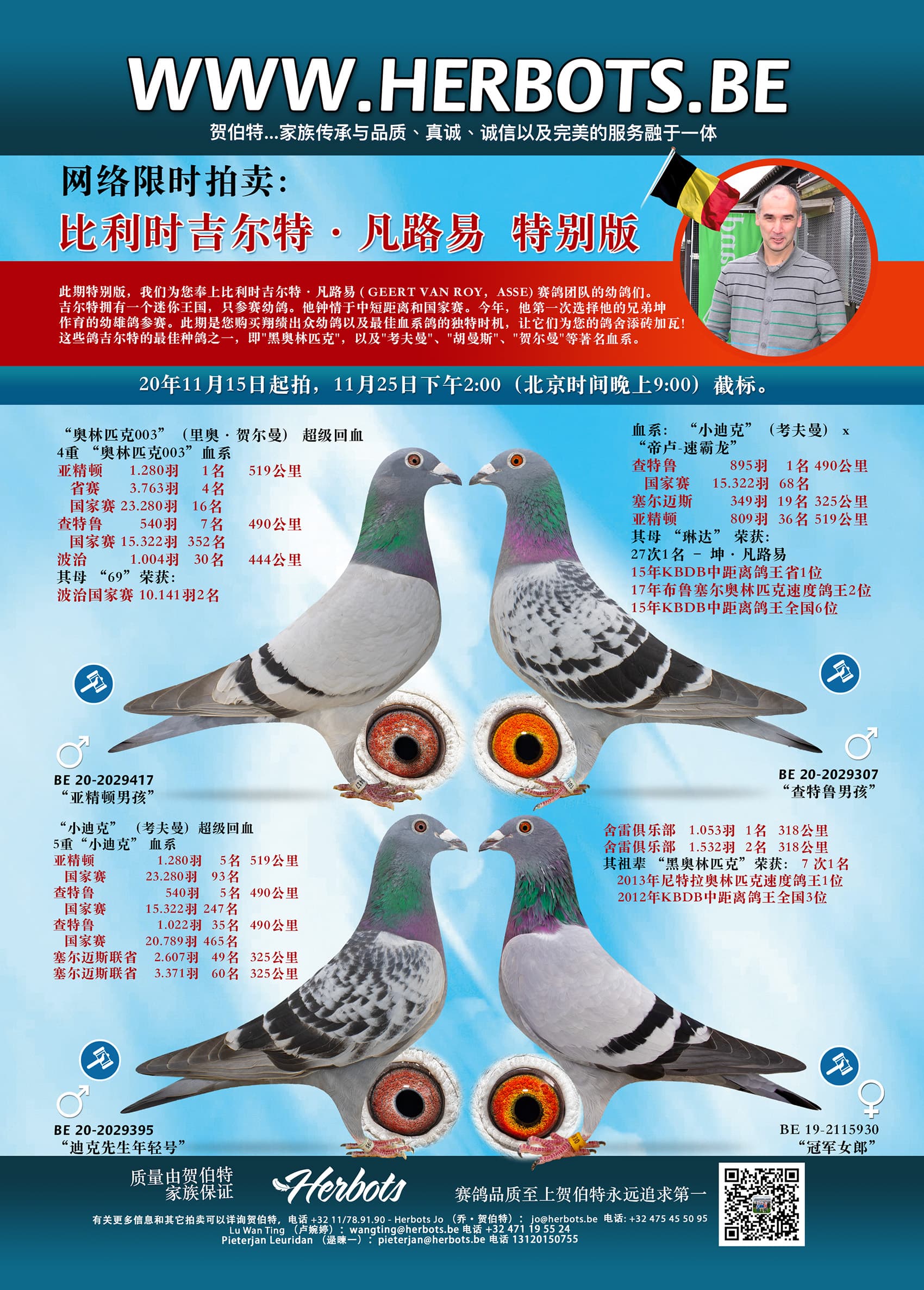 此期特别版,我们为您奉上比利时吉尔特·凡路易 ( GEERT VAN ROY,ASSE) 赛鸽团队的幼鸽们。吉尔特拥有一个迷你王国,只参赛幼鸽。他钟情于中短距离和国家赛。今年,他第一次选择他的兄弟坤作育的幼雄鸽参赛。此期是您购买翔绩出众幼鸽以及最佳血系鸽的独特时机,让它们为您的鸽舍添砖加瓦!这些鸽吉尔特的最佳种鸽之一,即"黑奥林匹克",以及"考夫曼"、"胡曼斯"、"贺尔曼"等著名血系。