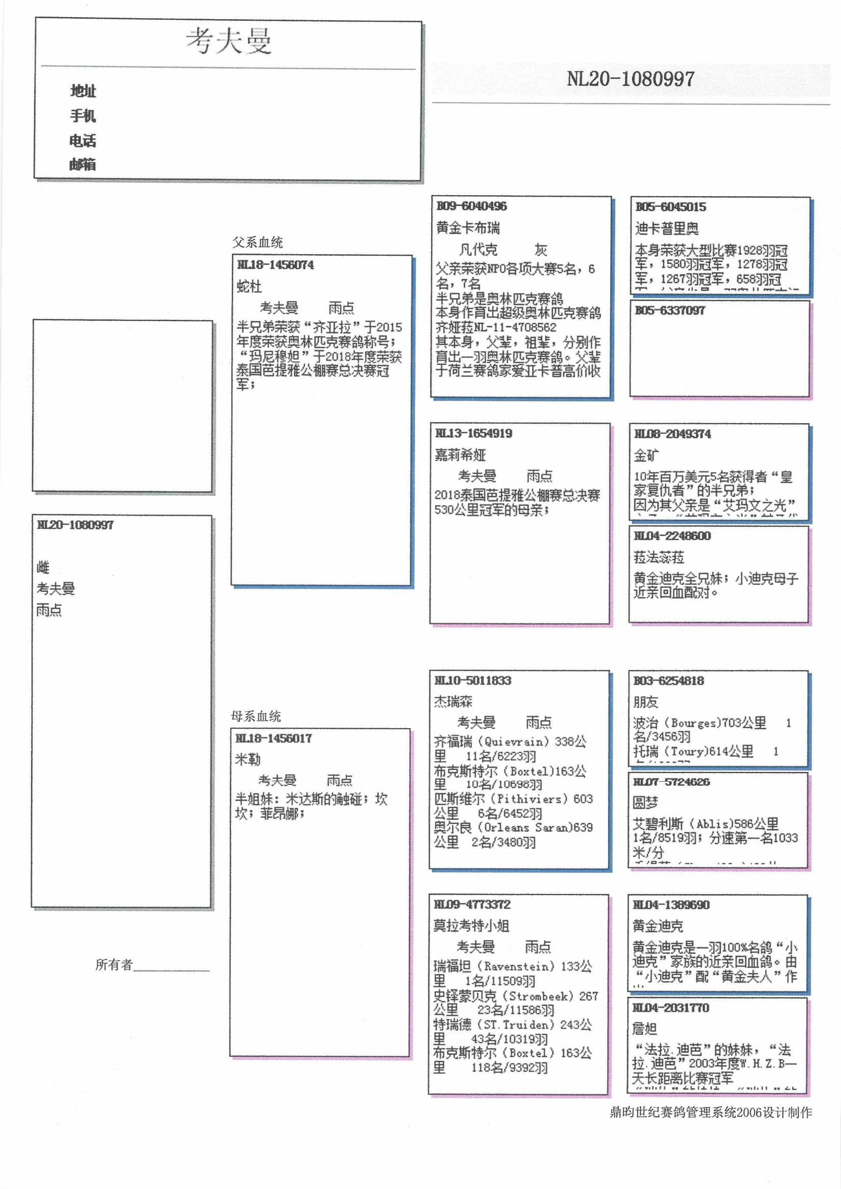带DNA检验证书“黄金卡布瑞”孙代鸽: “黄金卡布瑞”作育出代表赛鸽”齐亚拉”“嘉莉希娅”孙代鸽: 子代荣获泰国芭提雅公棚赛总决赛冠军;“杰瑞森”孙代鸽: 尼德拉奥林匹克评选鸽“莫拉考特小姐”孙代鸽:大型比赛1名/11509羽