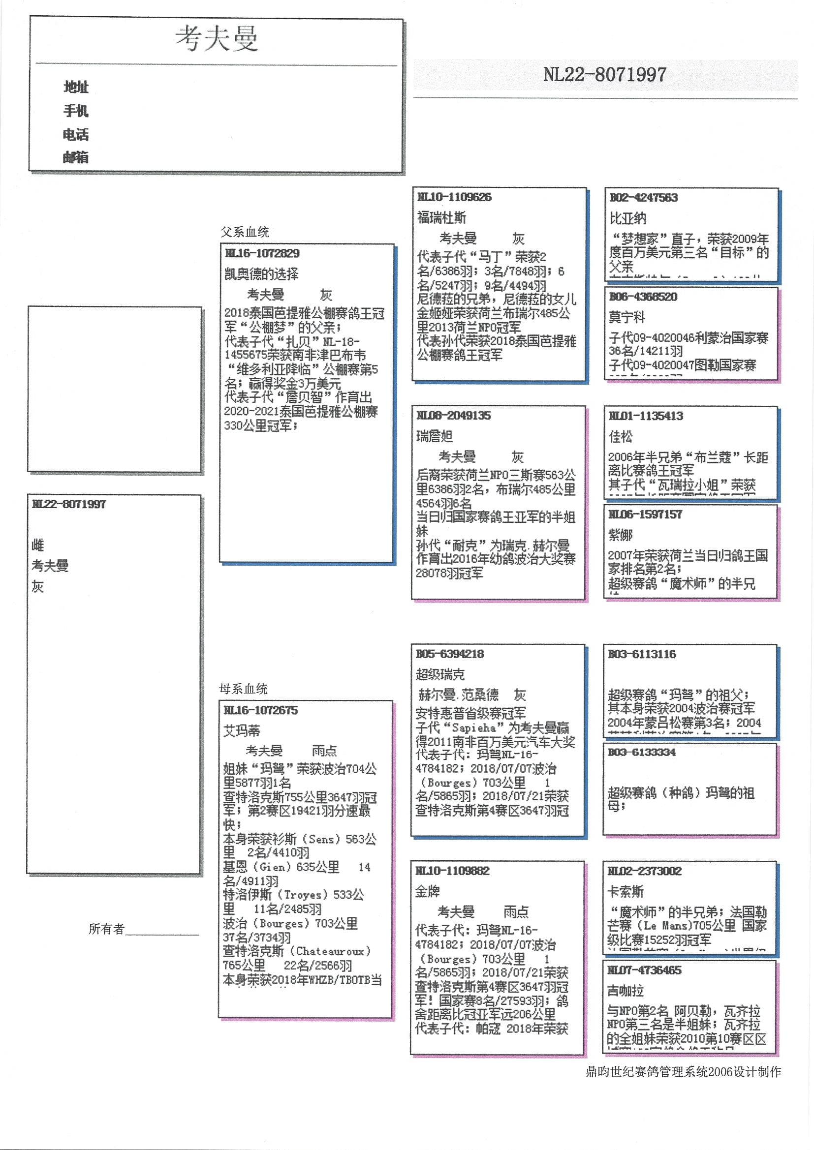 “玛弩”: NPO 查特鲁国家赛4区 3,647羽1名  - 19,192羽分速最高-  NPO 波治国家赛4区 5,877羽1名  – 森斯 1,069羽1名