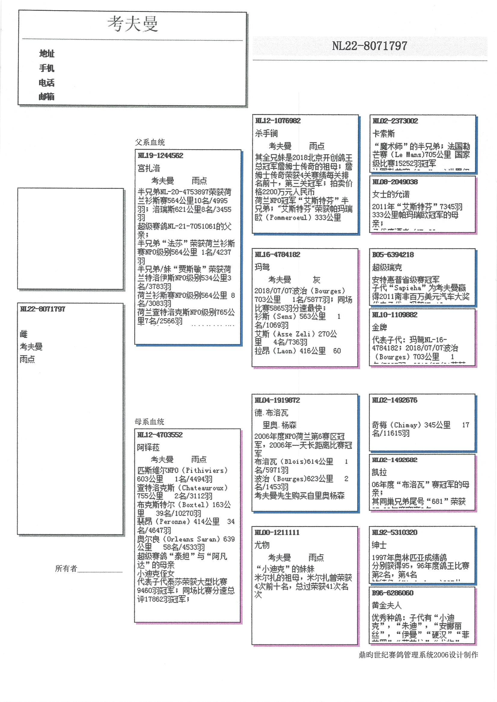 孙代代表及佳绩: “文多” (19年百万美元大奖赛决赛3名) – “阿玛诺” (罗礼斯国家赛4区 6,086羽1名) - “思凡” (森斯10-11区分速 10,701羽1名)