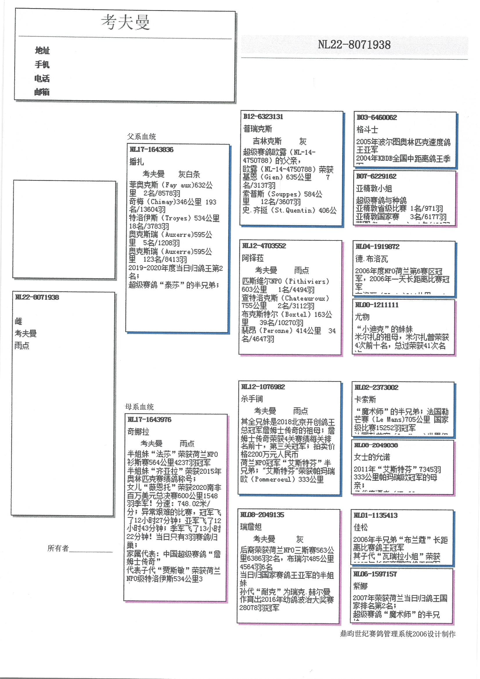孙代代表及佳绩:“耐克” (波治国家赛 28,078羽1名,R. 贺尔曼使翔)以及“琪拉”(奥林匹克代表鸽)