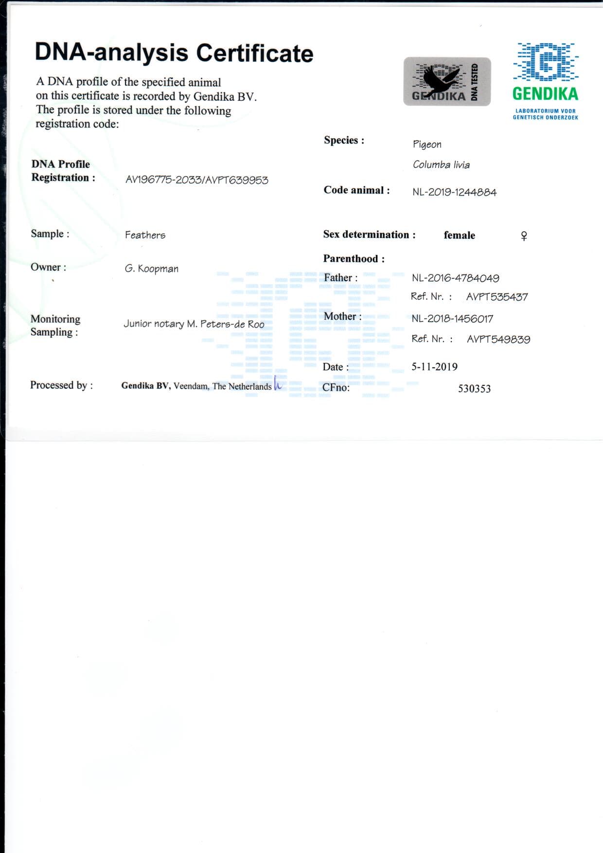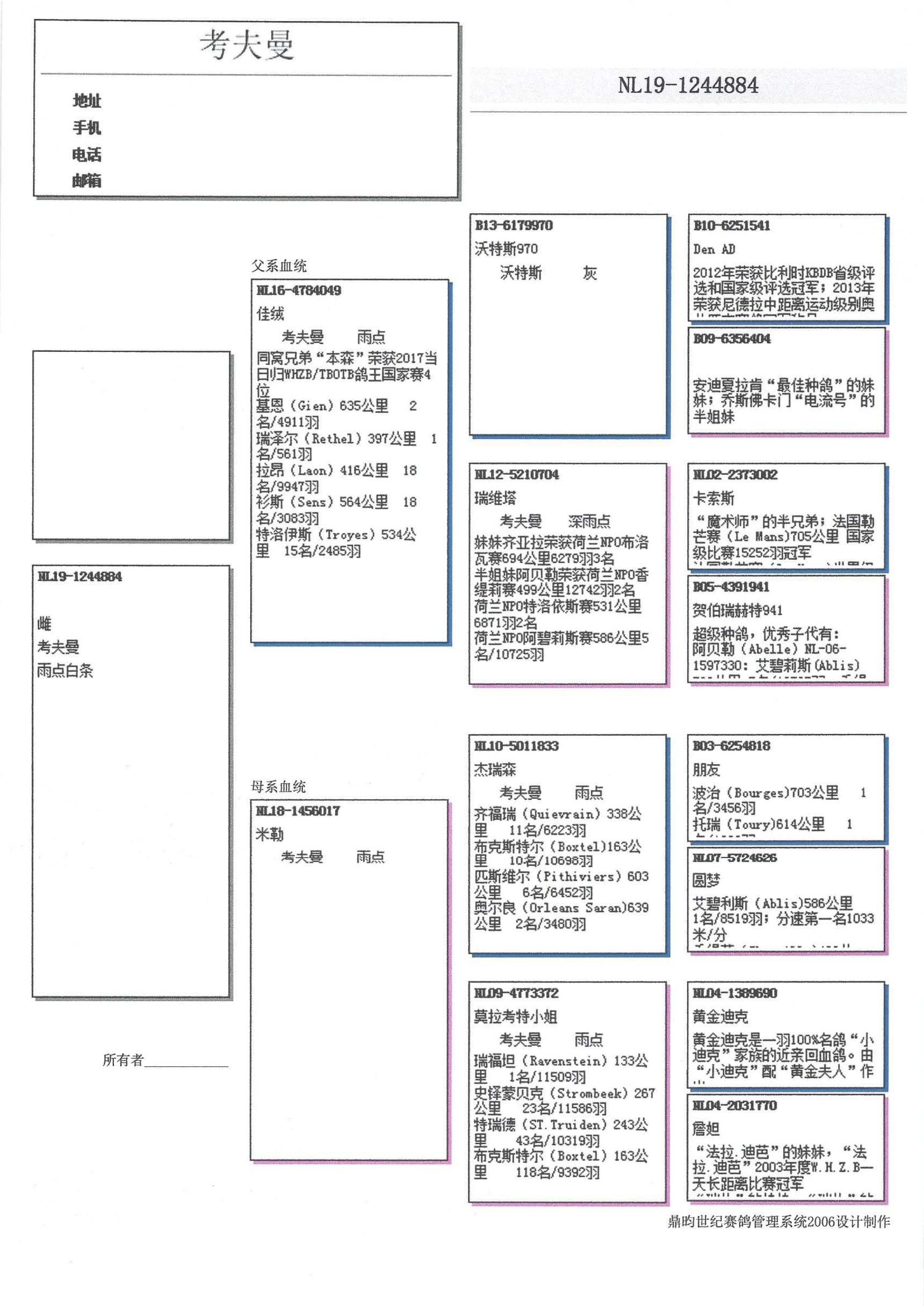 DNA 验证奥林匹克鸽王 “杰瑞森” 直孙女祖辈 “莫拉考特小姐” 荣获: 拉文斯坦 11,509羽1名 – 史坦贝克 11,586羽23名 – 圣特鲁登 10,319羽43名实力非凡种雌 “瑞维塔” 直孙女