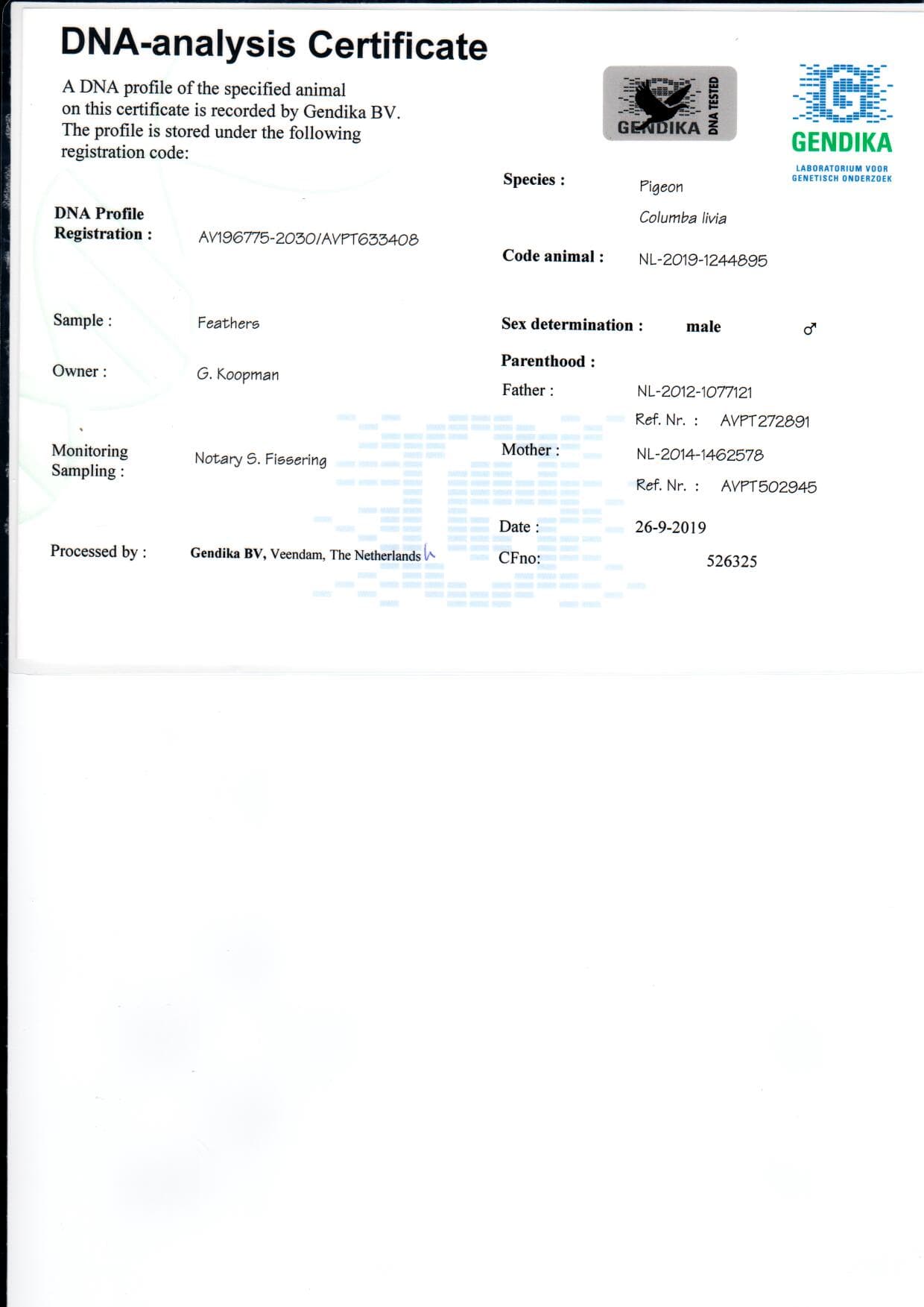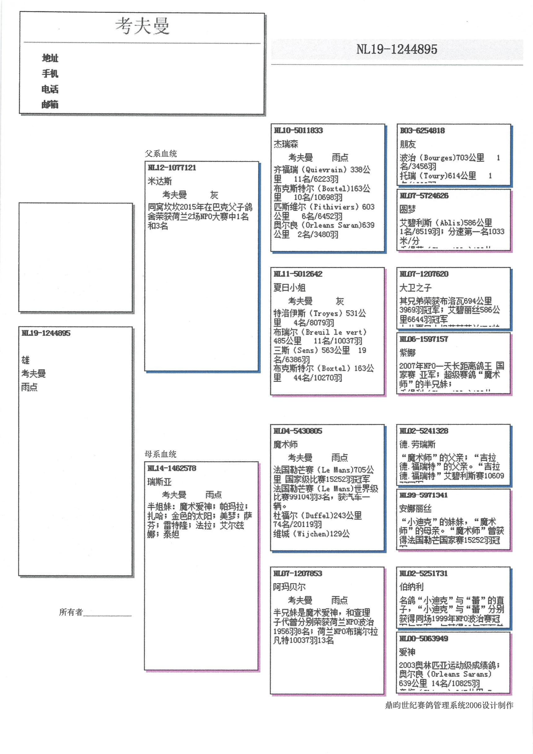 DNA 验证奥林匹克鸽王 “杰瑞森” x “夏日小姐” 直孙 "魔术师” (勒芒斯国家赛 15,252羽1名) x “阿玛贝尔” 直孙