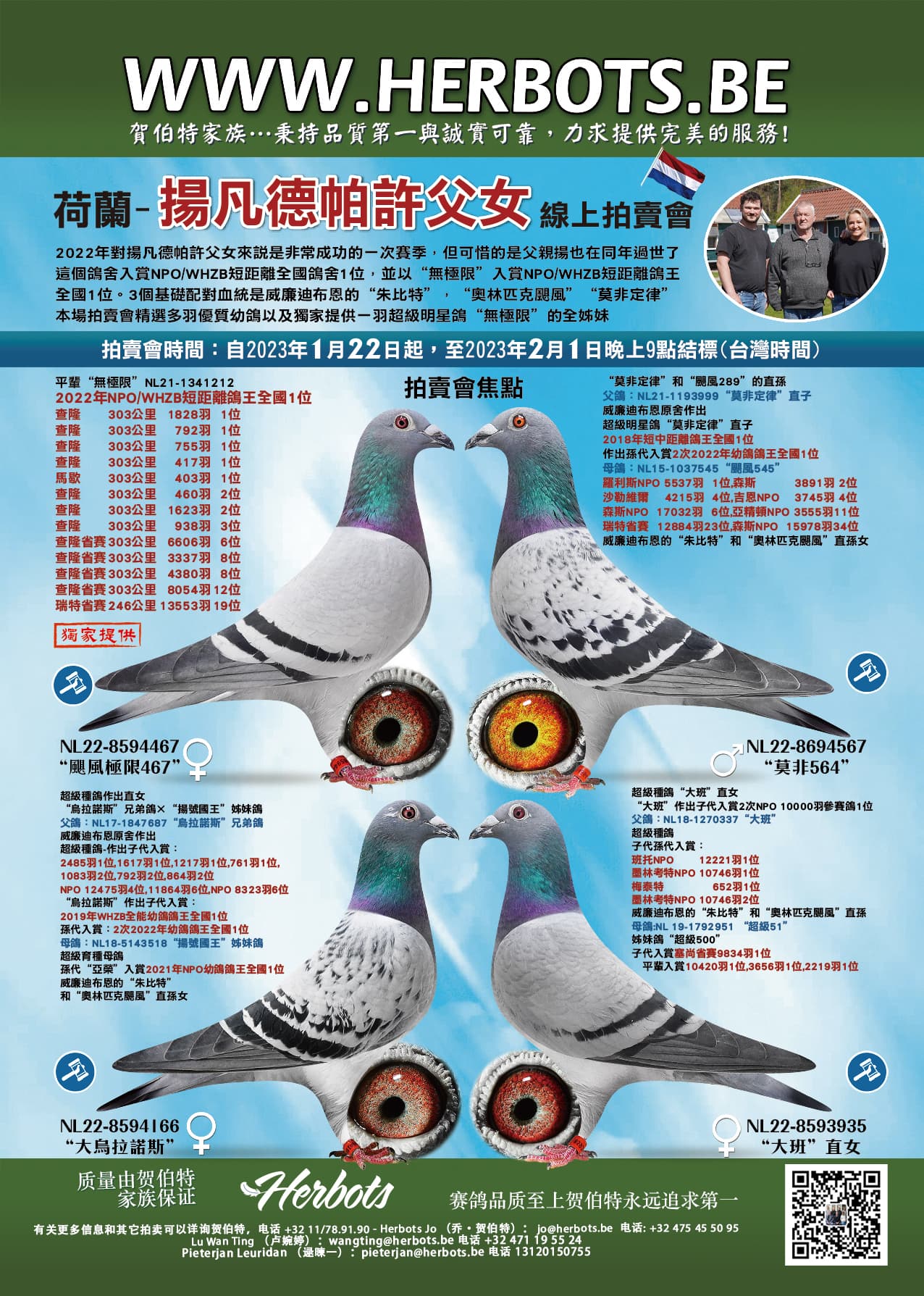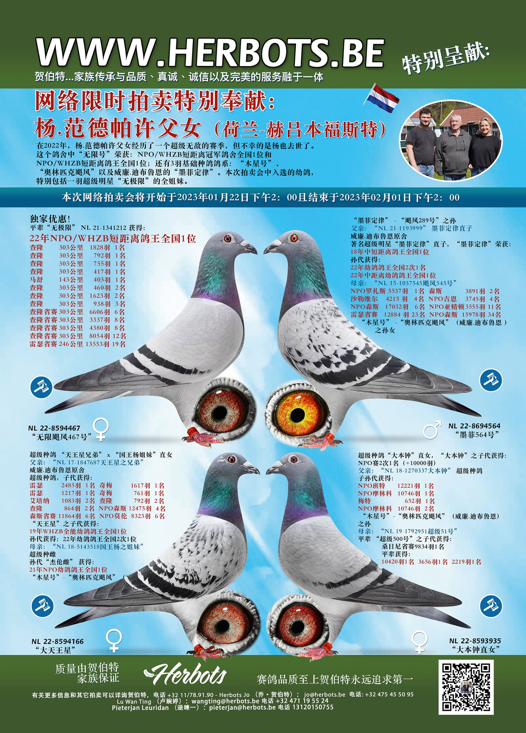 在2022年,杨.范德帕许父女经历了一个超级无敌的赛季,但不幸的是杨也去世了。这个鸽舍中“无限号”荣获:NPO/WHZB短距离冠军鸽舍全国1位和NPO/WHZB短距离鸽王全国1位;还有3羽基础种鸽鸽系:“木星号”、“奥林匹克飓风”以及威廉.迪布鲁恩的“墨菲定律”。本次拍卖会中入选的幼鸽,特别包括一羽超级明星“无极限”的全姐妹。