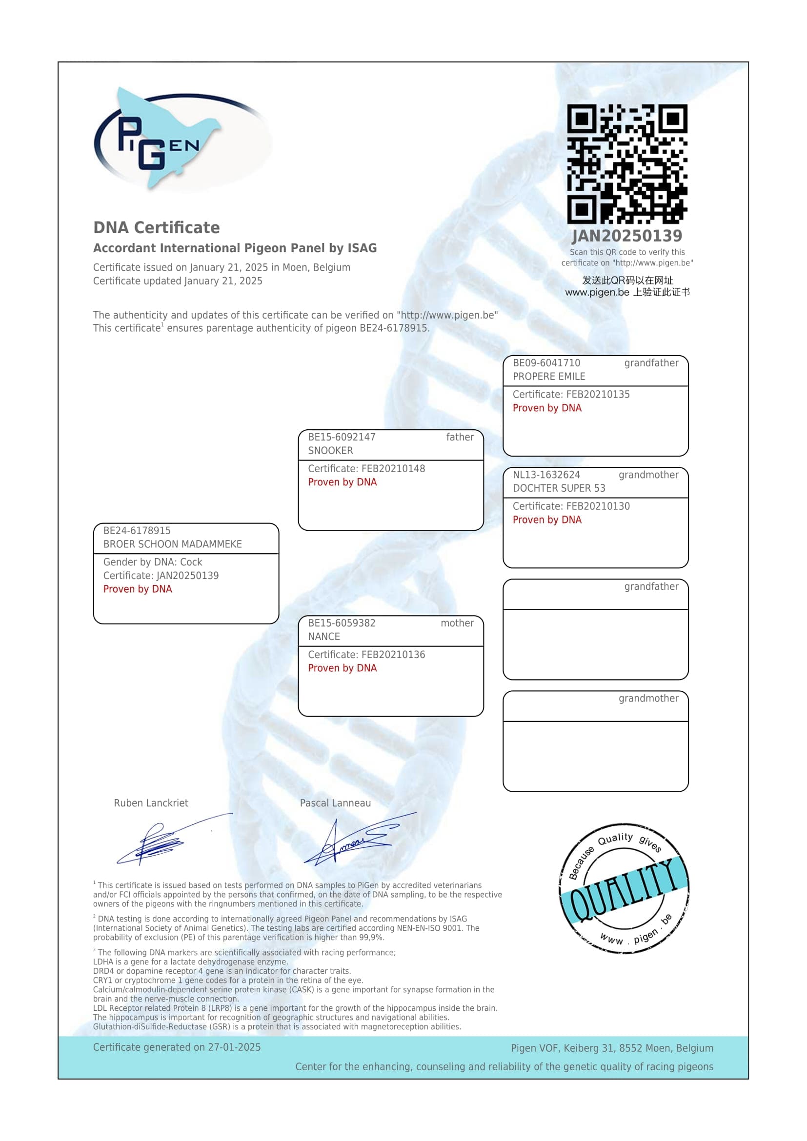 “乐天之母” (子代荣获:短距离幼鸽鸽王全国20位-“安特卫普联盟”中距离一岁鸽王1位)