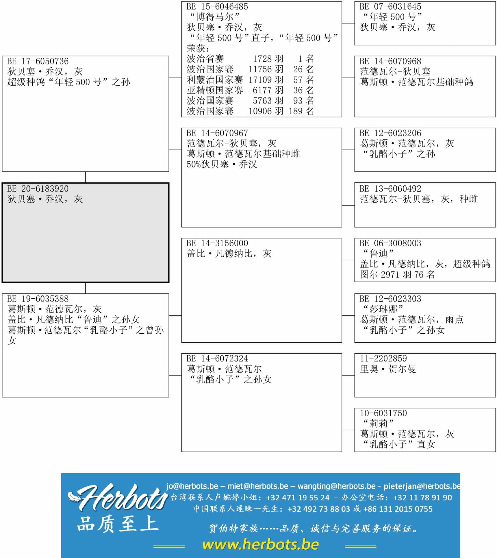 父亲:BE17-6050736“年轻500号”之孙,“年轻500号”荣获:波治省赛1728羽1名国家赛11756羽26名查特鲁国家赛17109羽57名利蒙治国家赛10448羽86名亚精顿国家赛5034羽154名世界名鸽“乳酪小子”回血母亲:BE19-6035388 葛斯顿·范德瓦尔原舍盖比·凡德纳比“鲁迪”之孙女世界名鸽“乳酪小子”之曾孙女