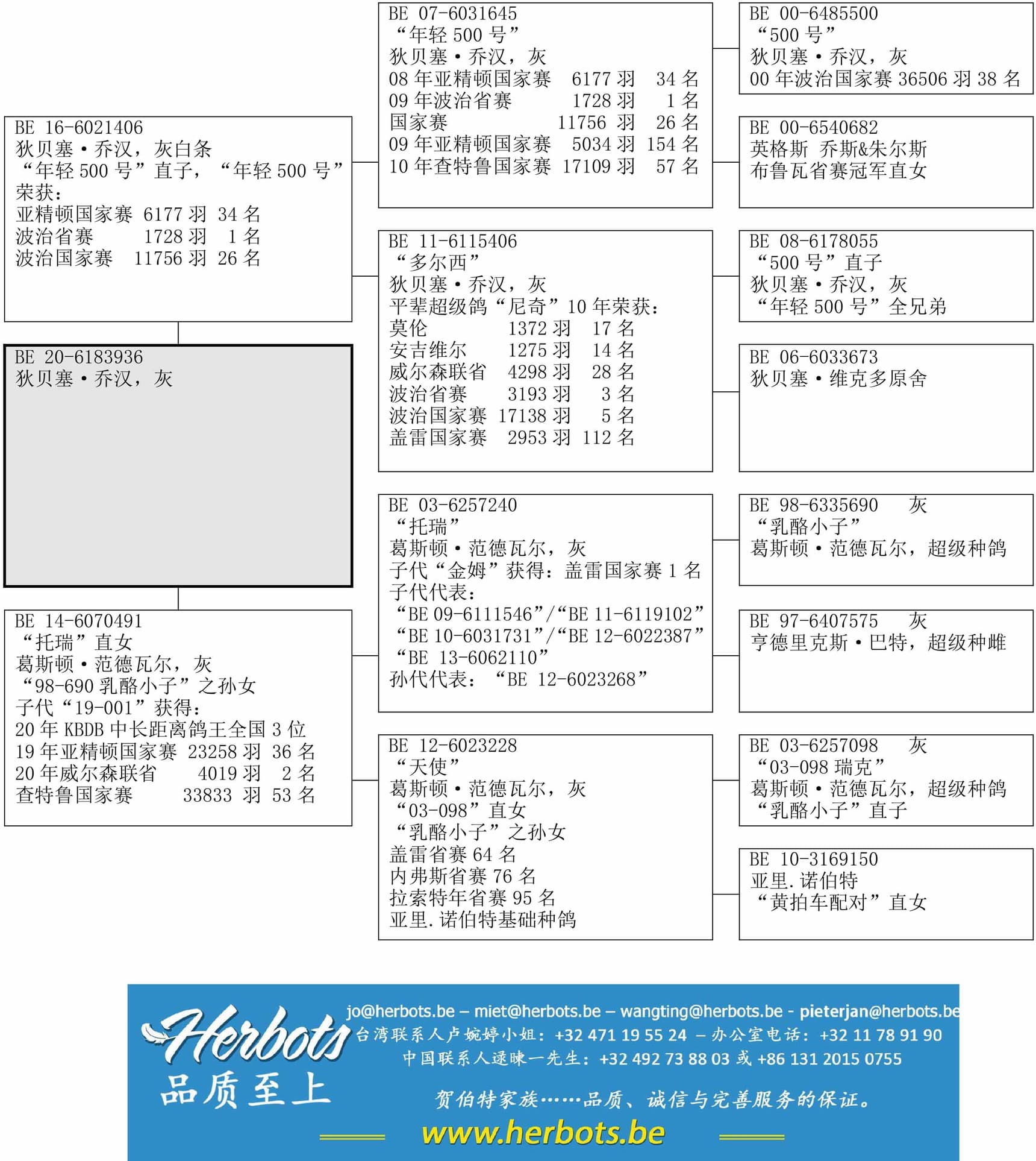半平辈“001号”(同母)获得:20年KBDB 中长距离鸽王全国3位威尔森联省 4019羽 2名亚精顿国家赛 26085羽 21名查特鲁国家赛 33833羽 53名拉索特年国家赛 15939羽 62名BE03-6257240 “托瑞”(葛斯顿·范德瓦尔原舍)之孙世界名鸽“乳酪小子”最佳直子“托瑞”之子代“金姆”获得:盖雷国家赛冠军