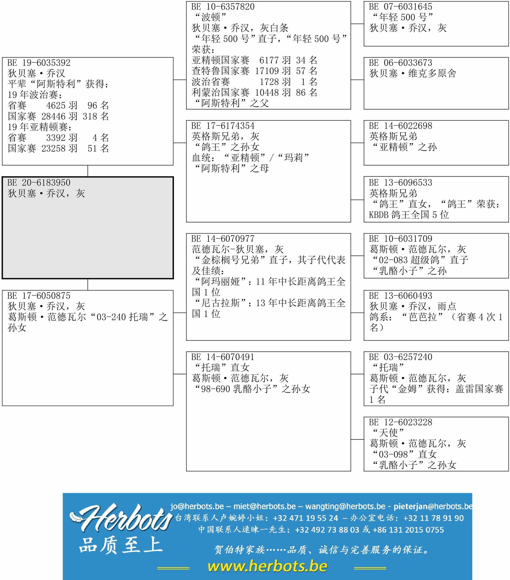 父亲:BE19-6035392“阿斯特利兄弟”“阿斯特利”获得:亚精顿省赛 3392羽 4名亚精顿国家赛 23258羽 51名威尔森联省 4019羽 34名波治国家赛 28446羽 318名母亲:BE17-6050875“托瑞之孙女”BE03-6257240 “托瑞”(葛斯顿·范德瓦尔原舍)世界名鸽“乳酪小子”最佳直子“托瑞”之子代“金姆”获得:盖雷国家赛冠军
