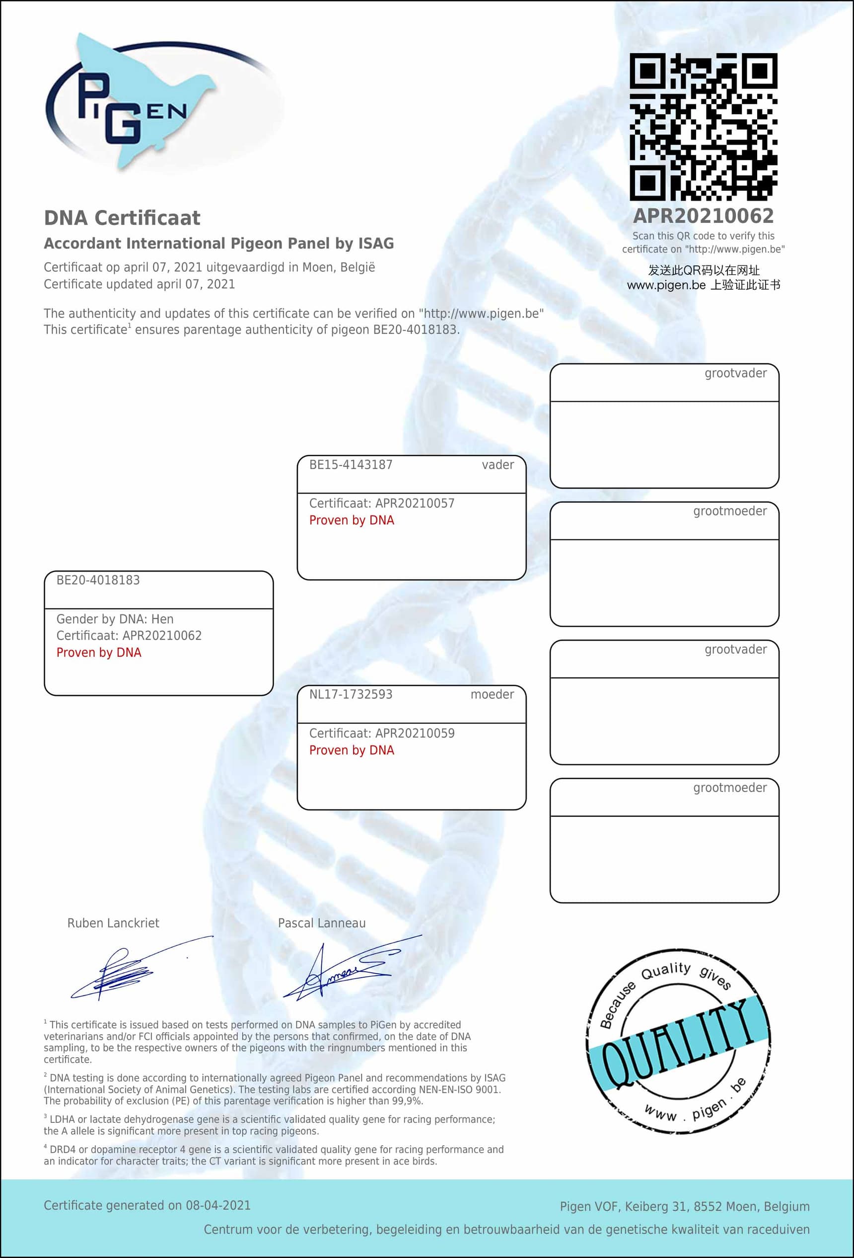 带DNA检验证书