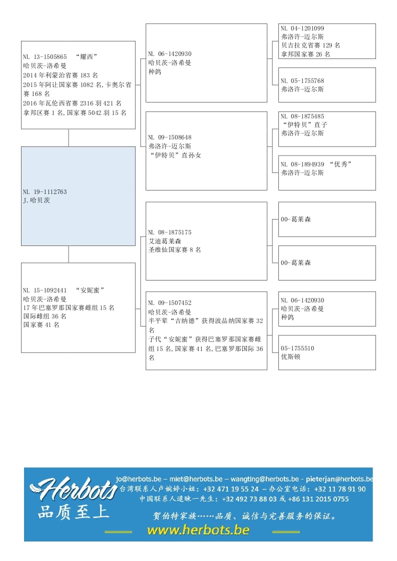 父亲 “NL 13-1505865” “耀西” 拿邦国家赛 5.042羽15名 弗洛许-迈尔斯的“伊特贝” 直系母亲 “NL 15-1092441” “安妮蜜” 巴塞罗那国家赛 4.504羽 41名1096公里 国际 17.026羽 96名 圣维仙国家赛8名作出直女 葛莱森 x 弗洛许-迈尔斯