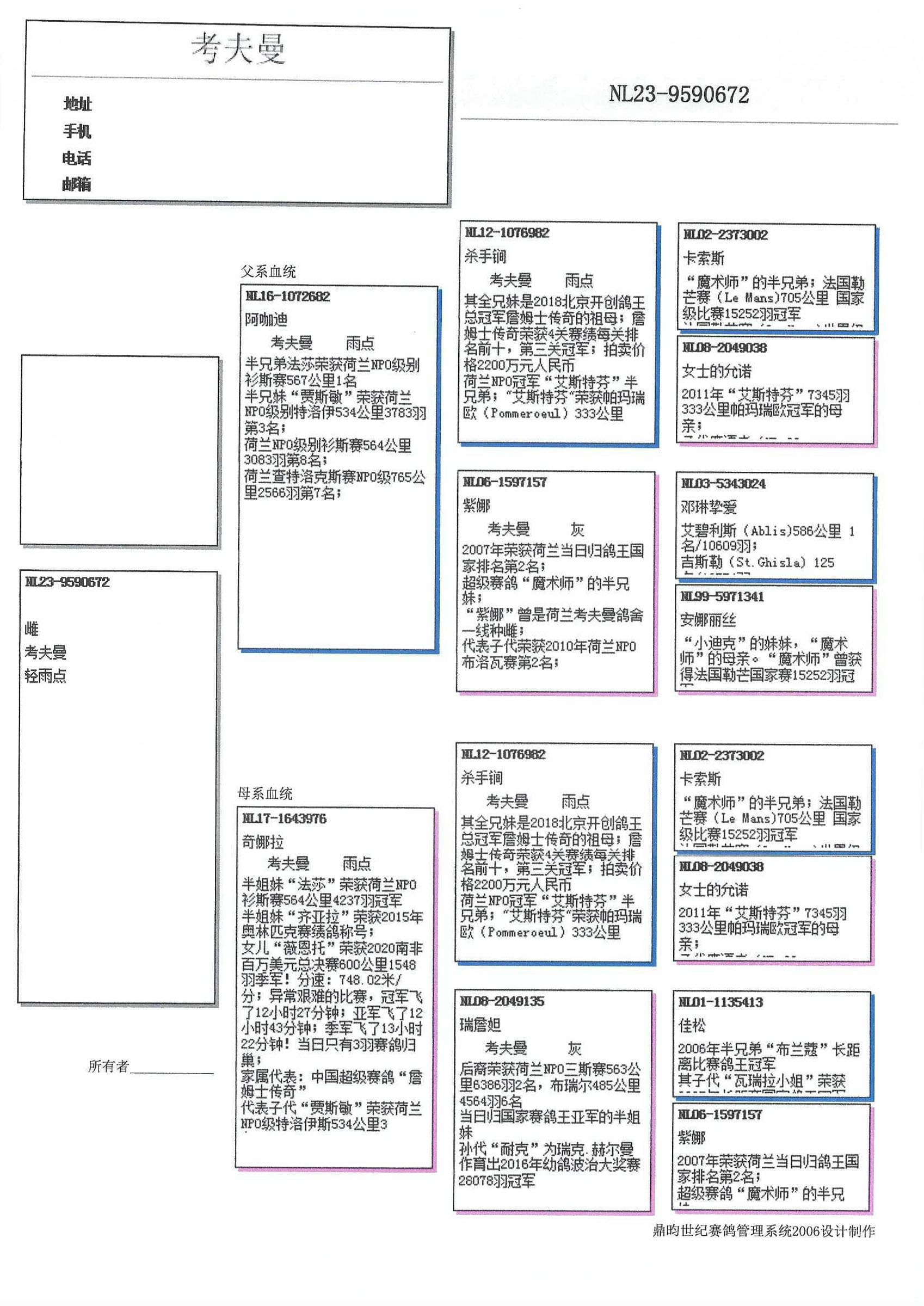 孙代代表及佳绩:“耐克” (波治国家赛 28,078羽1名, R. 贺尔曼使翔)以及“琪拉”(奥林匹克代表鸽)