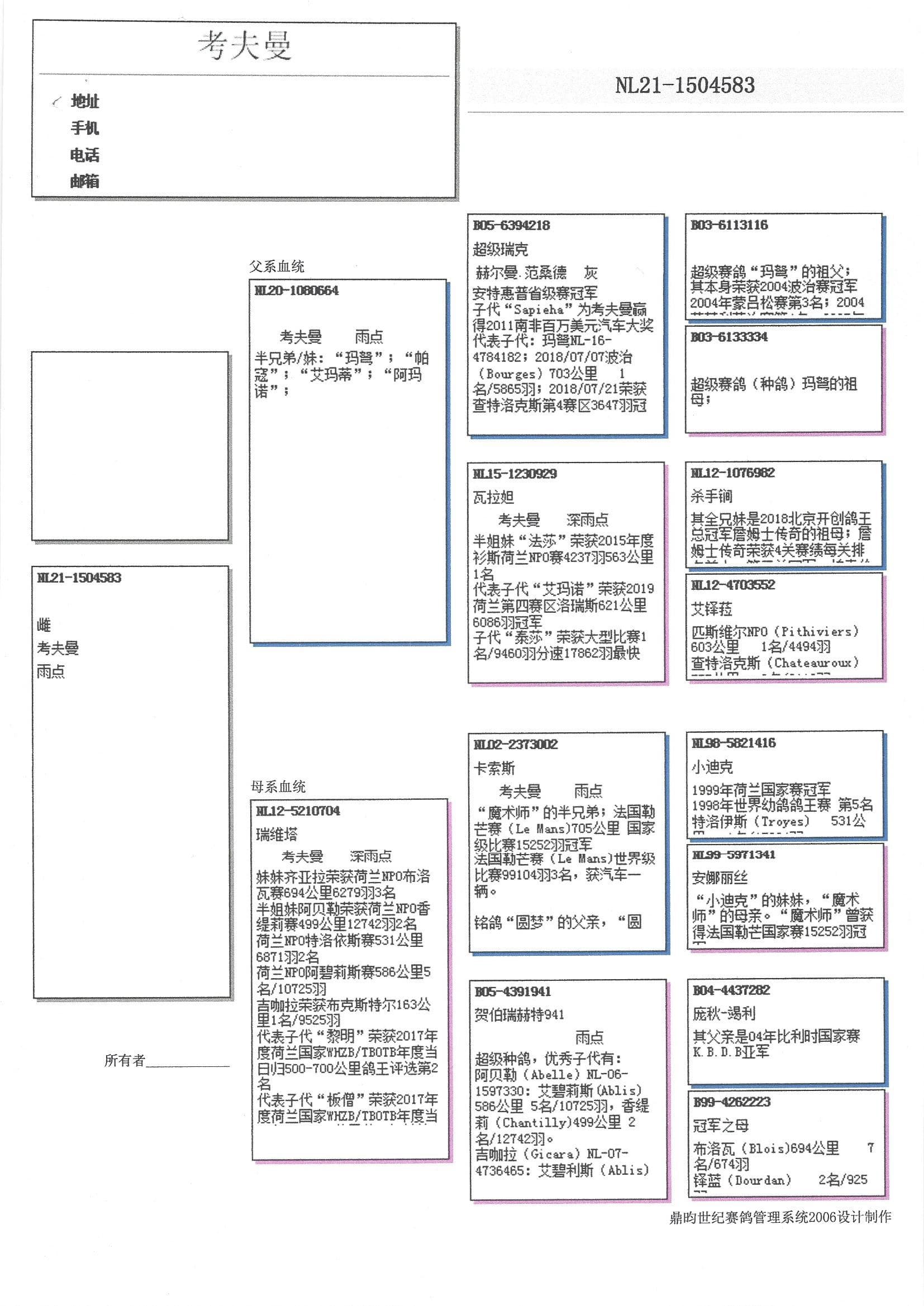 “玛弩”: NPO 查特鲁国家赛4区 3,647羽1名 - 分速19,192羽1名- NPO 波治国家赛4区 5,877羽1名 – 森斯 1,069羽1名