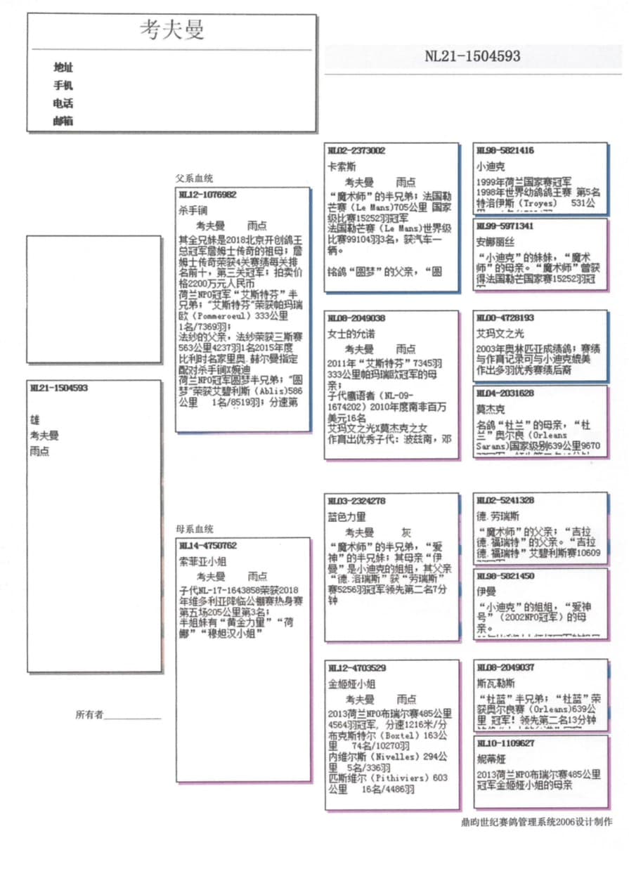 孙代代表及佳绩:“文多” (19年百万美元大奖赛决赛3名) – “阿玛诺” (罗礼斯国家赛4区 6,086羽1名) -“思凡” (森斯10-11区分速10,701羽1名)