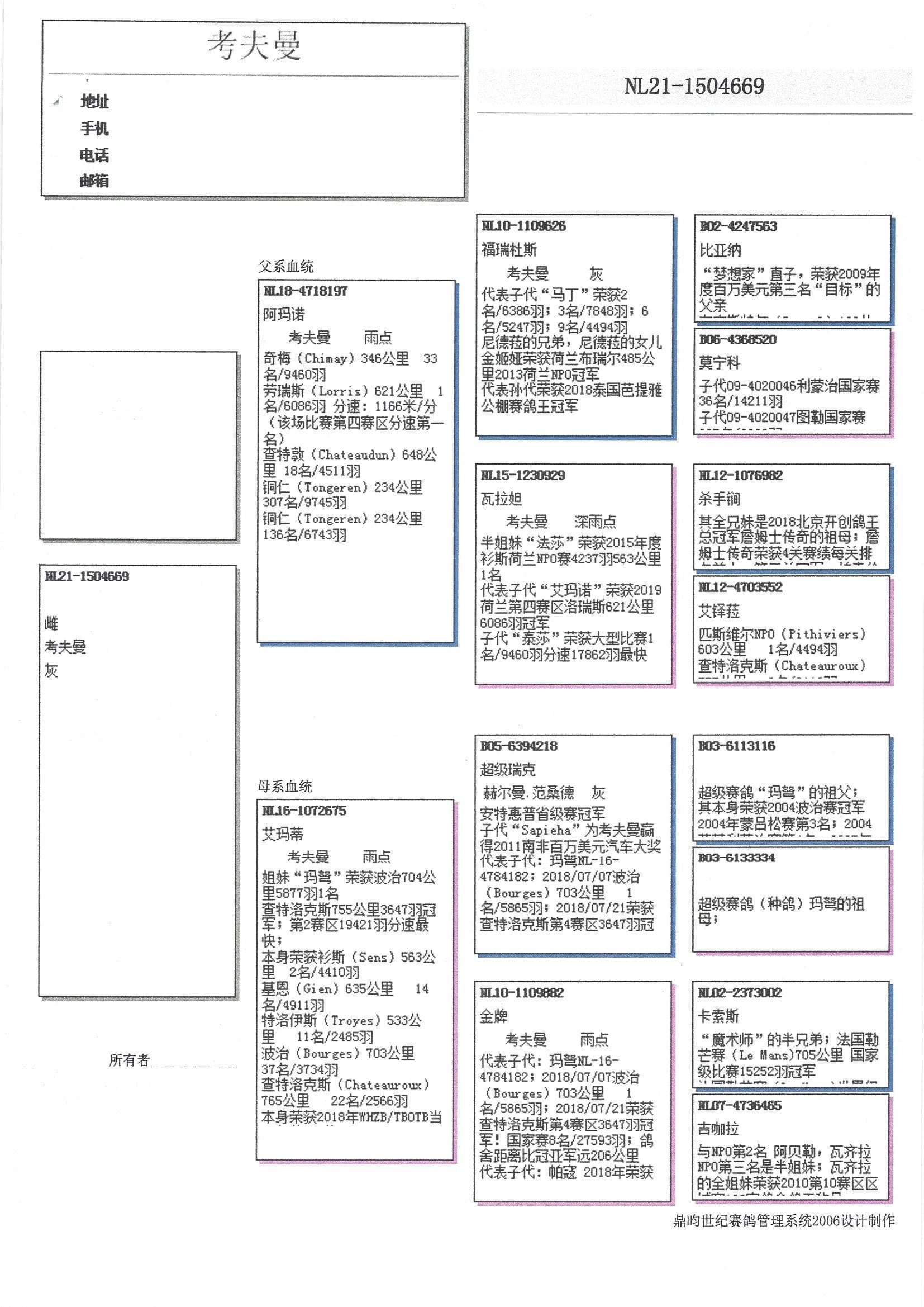 荣获: 罗礼斯国家赛区  6,086羽  1名