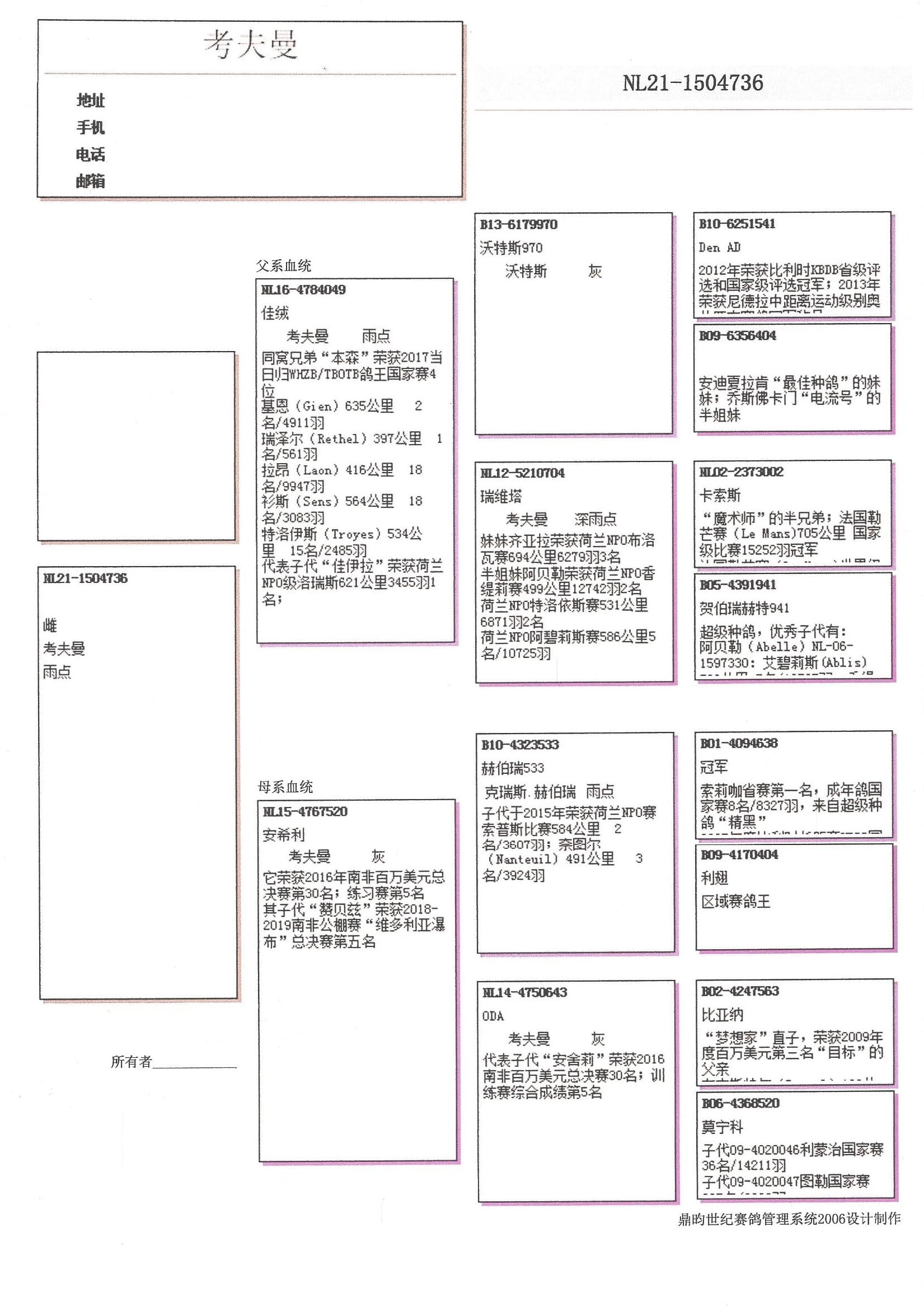 子代代表及佳绩:“泽莉娜” (NPO 罗礼斯 1,727羽11名