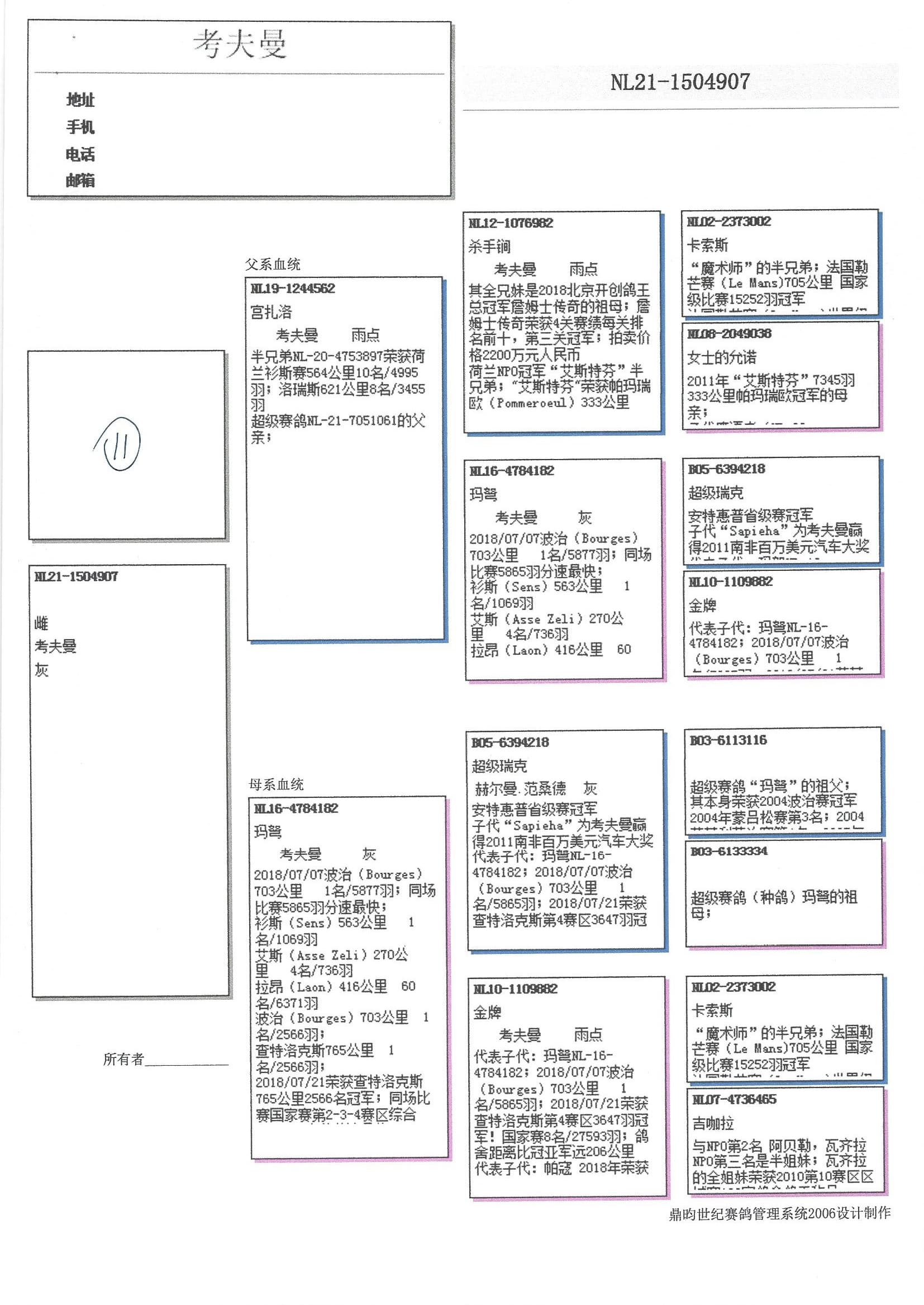 孙代代表及佳绩: “玛弩维多利亚” (2021年维多利亚秋季公棚赛决赛11名) – “杰米娜” (NPO 罗礼斯 3,455羽6名)