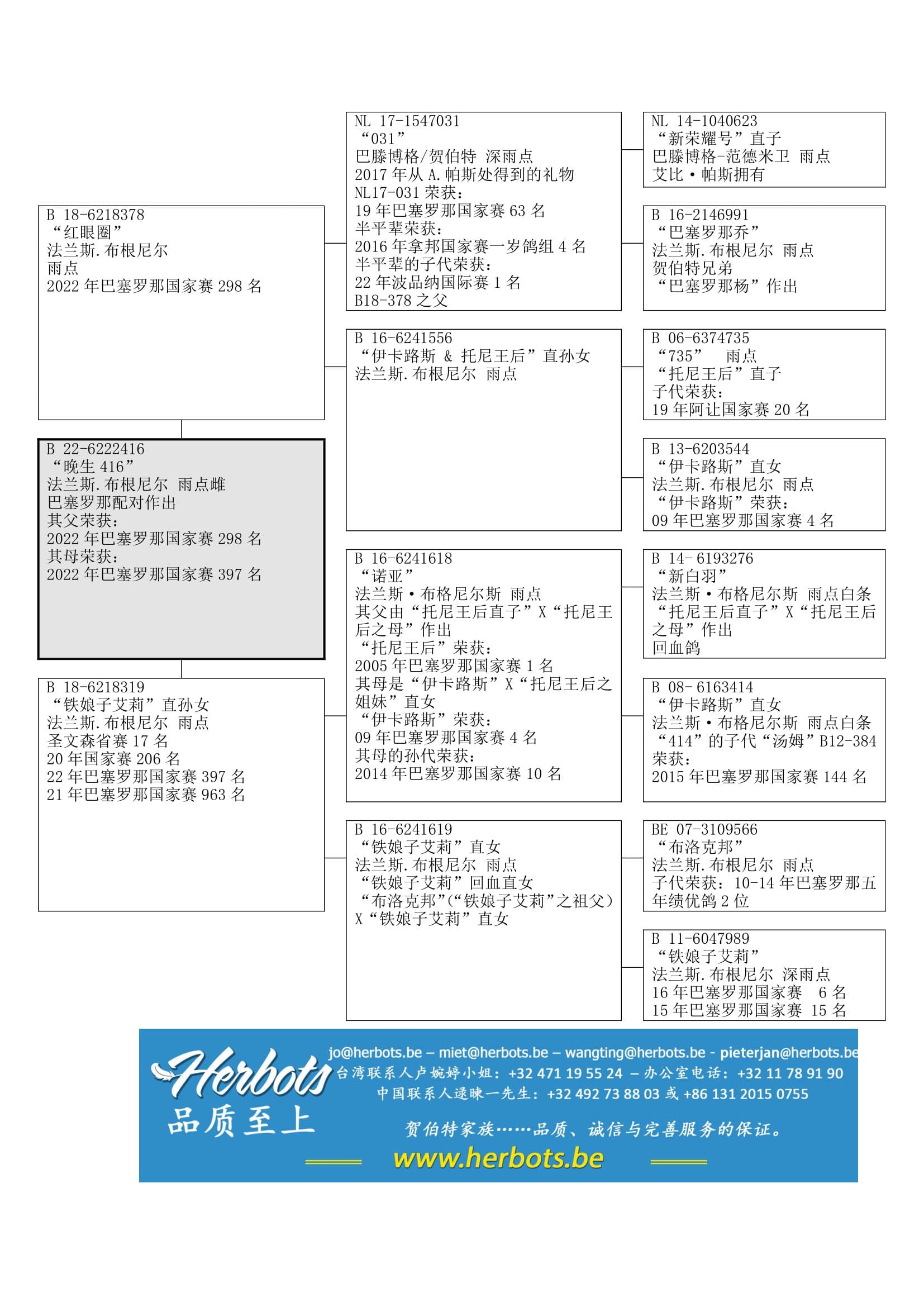 “布洛克邦” (基础种鸽之一)x “铁娘子艾莉” (16年巴塞罗那国家赛 6名以及15年巴塞罗那国家赛15名) 作出