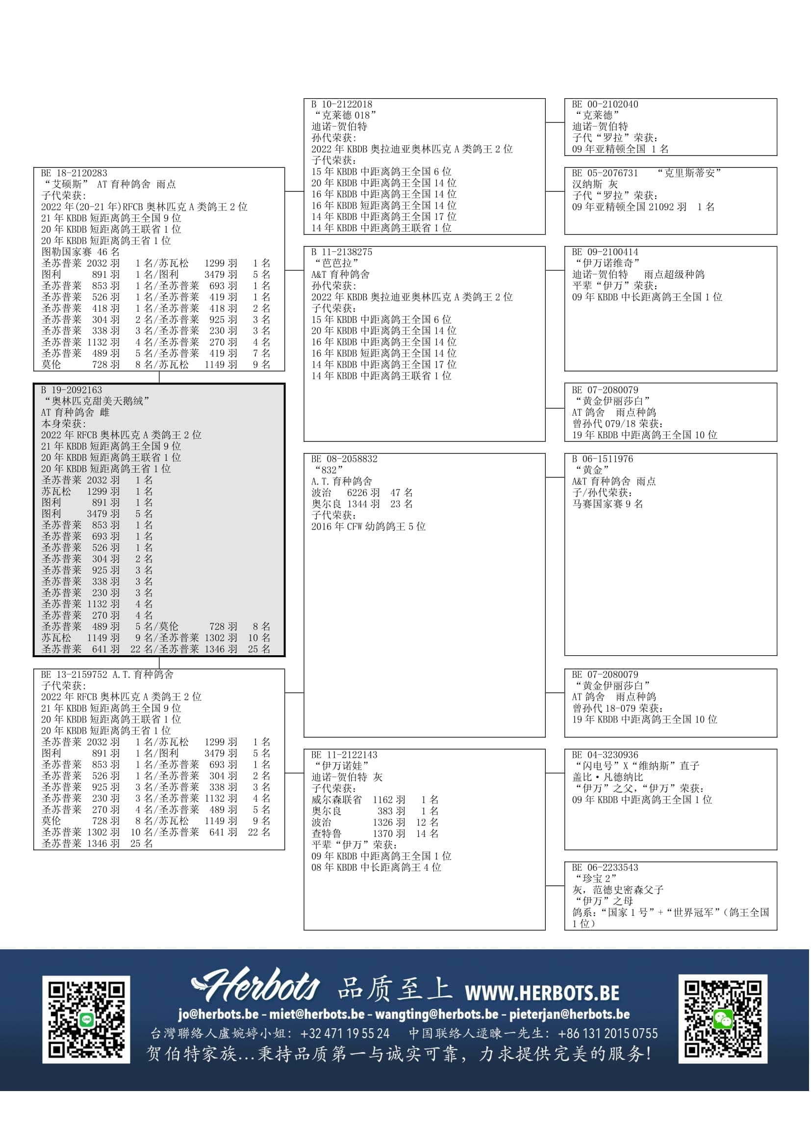 “克莱德 018” (全平辈代表及佳绩: “罗拉”: 亚精顿国家赛1名 - “加拉斯”: 西欧国家杯长距离鸽王2位 - “强将”: 波治1名, 图尔省赛 2,055羽2名 - “吉蒙迪”: 顶级种鸽) x “芭芭拉” (出自 “伊万之全兄弟”(贺伯特) x “飞斧回血” (贺博瑞) )作出