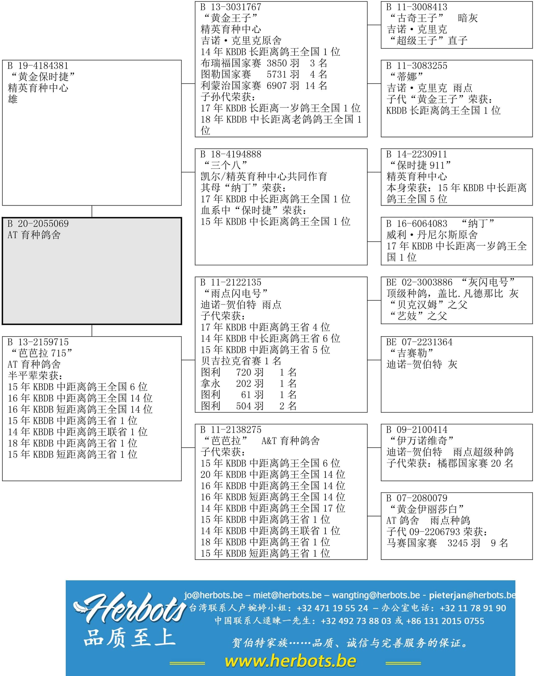 荣获: 2014年KBDB长距离鸽王全国1位– 布瑞福国家赛 3,850羽3名 – 图勒国家赛 5,731羽4名 – 利蒙治国家赛 6,907羽14名