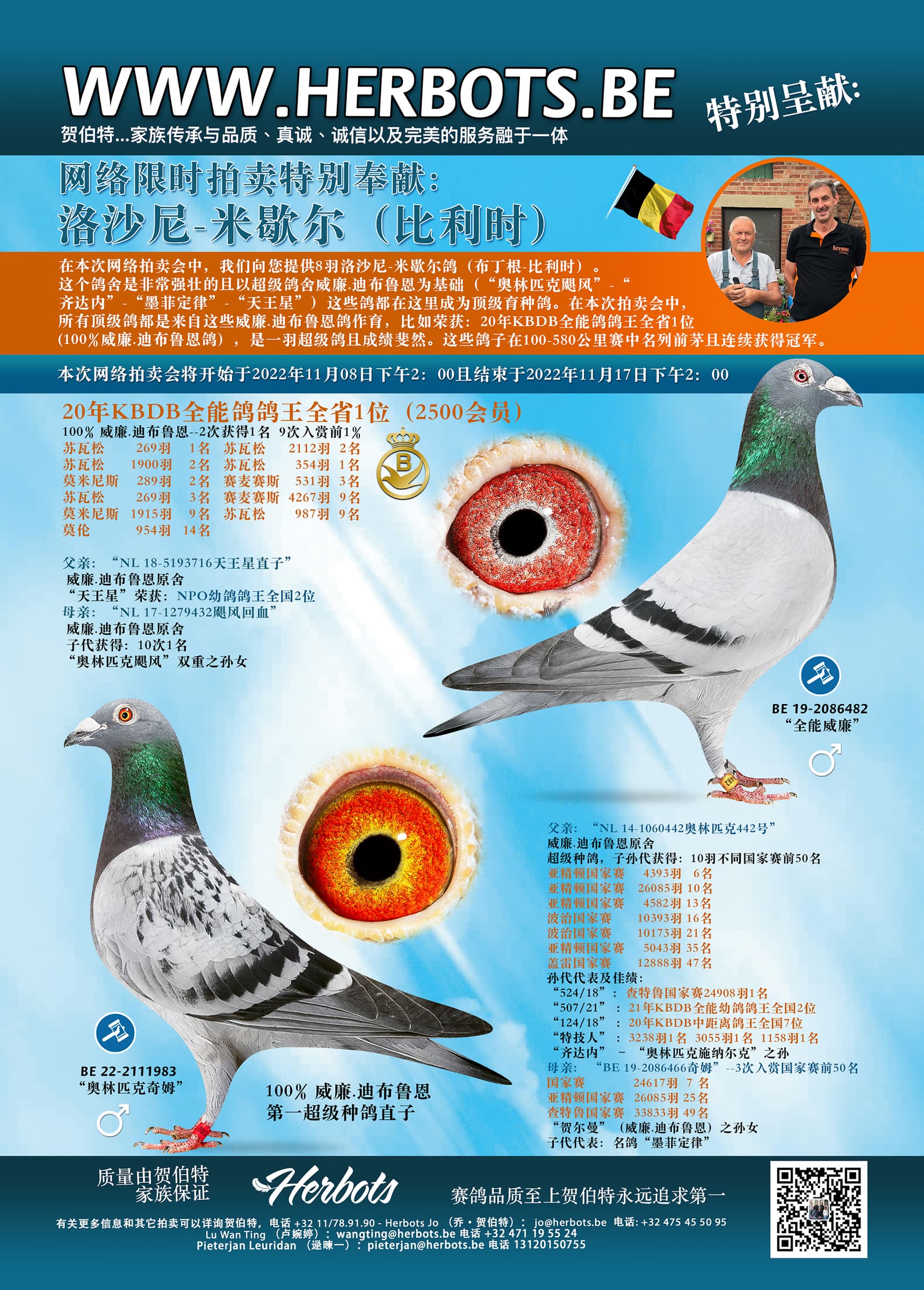 在本次网络拍卖会中,我们向您提供8羽洛沙尼-米歇尔鸽(布丁根-比利时)。这个鸽舍是非常强壮的且以超级鸽舍威廉.迪布鲁恩为基础(“奥林匹克飓风”-“齐达内”-“墨菲定律”-“天王星”)这些鸽都在这里成为顶级育种鸽。在本次拍卖会中,所有顶级鸽都是来自这些威廉.迪布鲁恩鸽作育,比如荣获:20年KBDB全能鸽鸽王全省1位(100%威廉.迪布鲁恩鸽),是一羽超级鸽且成绩斐然。这些鸽子在100-580公里赛中名列前茅且连续获得冠军。