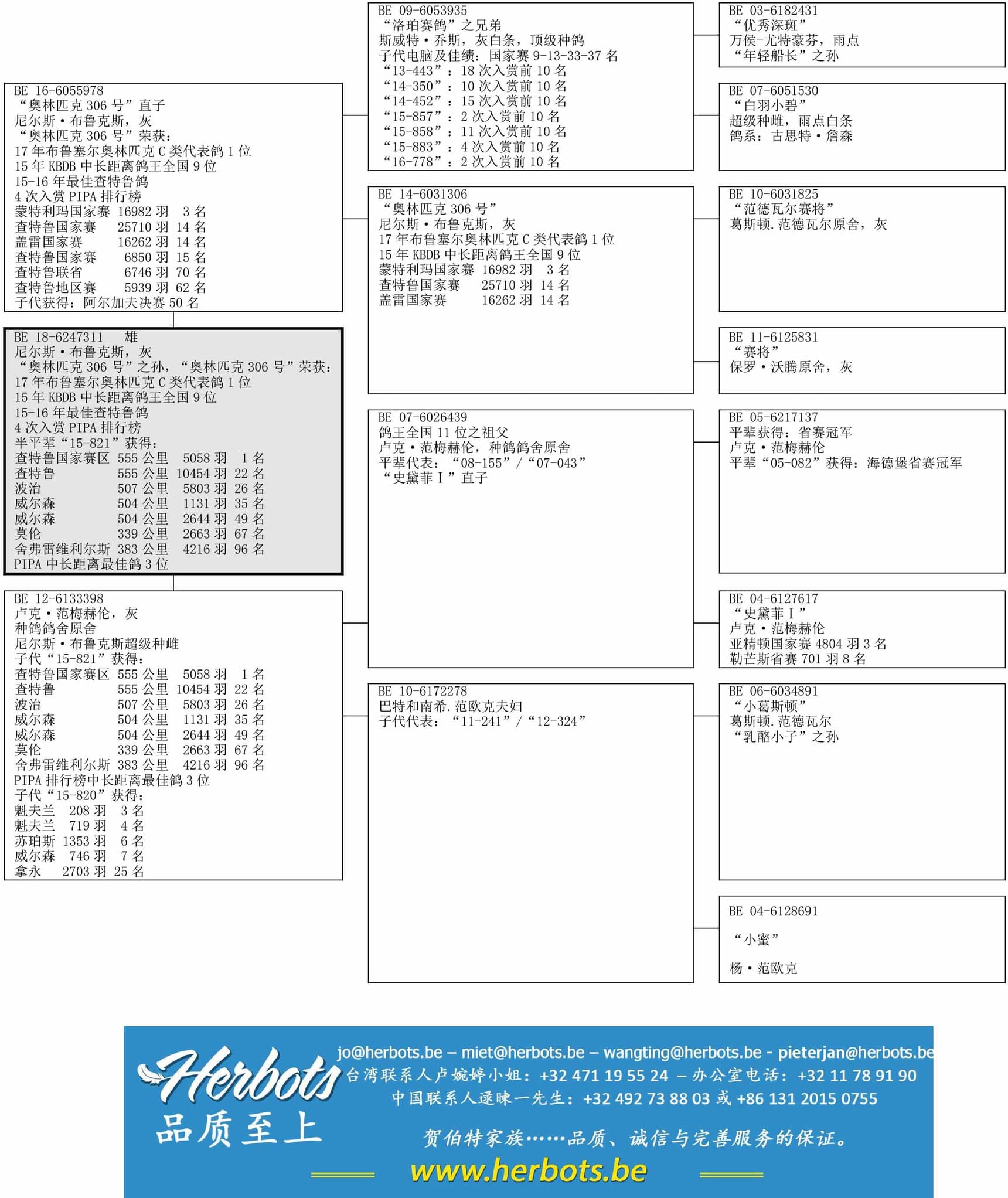 母亲: 种鸽鸽舍布鲁克斯原舍历经考验的种雌,子代获得:查特鲁国家赛区 5058羽 1名 - 查特鲁国家赛 10454羽 22名 - 苏珀斯 1353羽 6名 - 拿永 2703羽 25名 - 威尔森 1131羽 35名