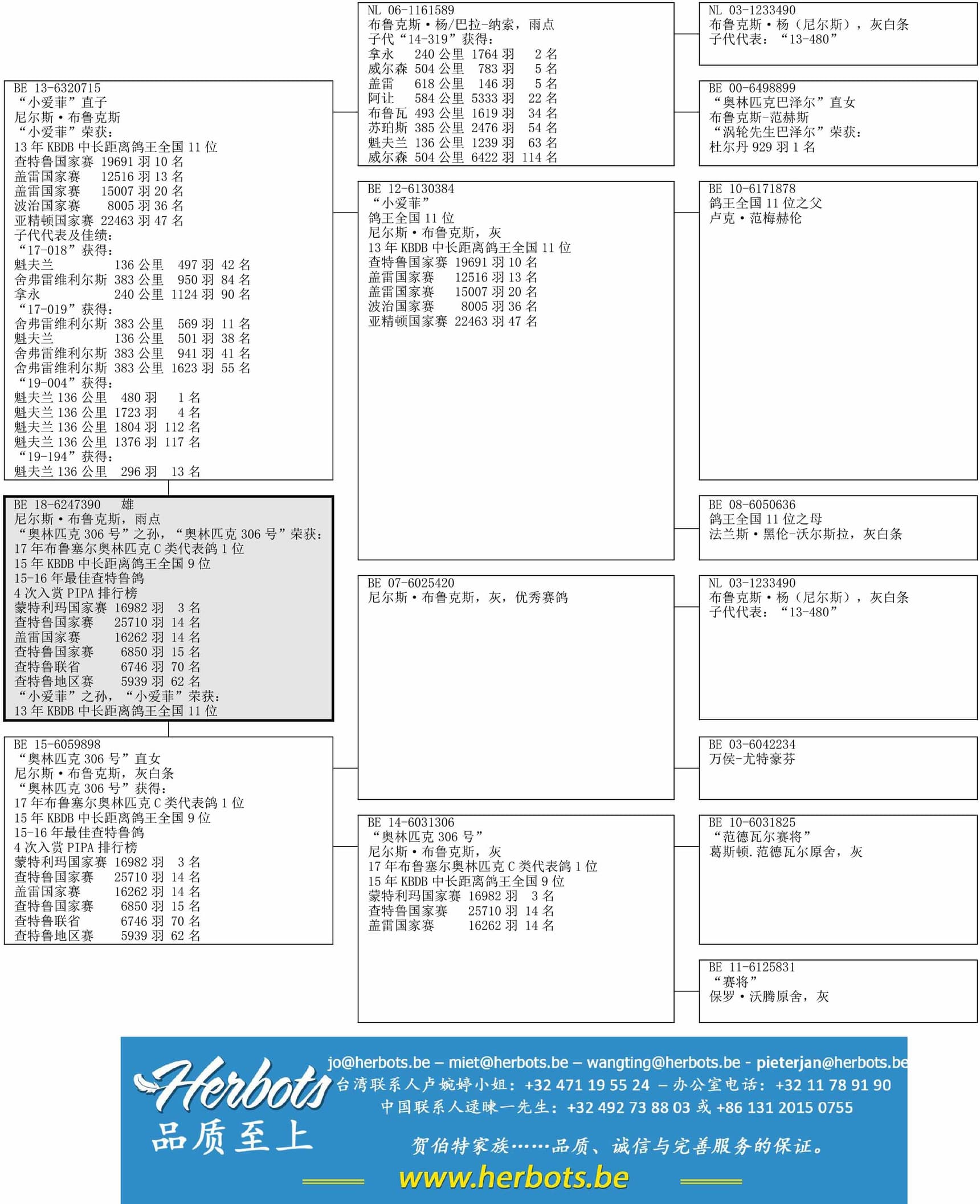 父亲:BE 13-6320715“小爱菲直子”历经考验的种鸽,子代获得:480羽1名 1723羽4名 569羽11名 - 501羽38名 941羽41名 “小爱菲”荣获:11年KBDB中长距离鸽王全国11位母亲:BE 15-6059898“奥林匹克306号直女”“奥林匹克306号”荣获:17年布达佩斯奥林匹克C类代表鸽1位