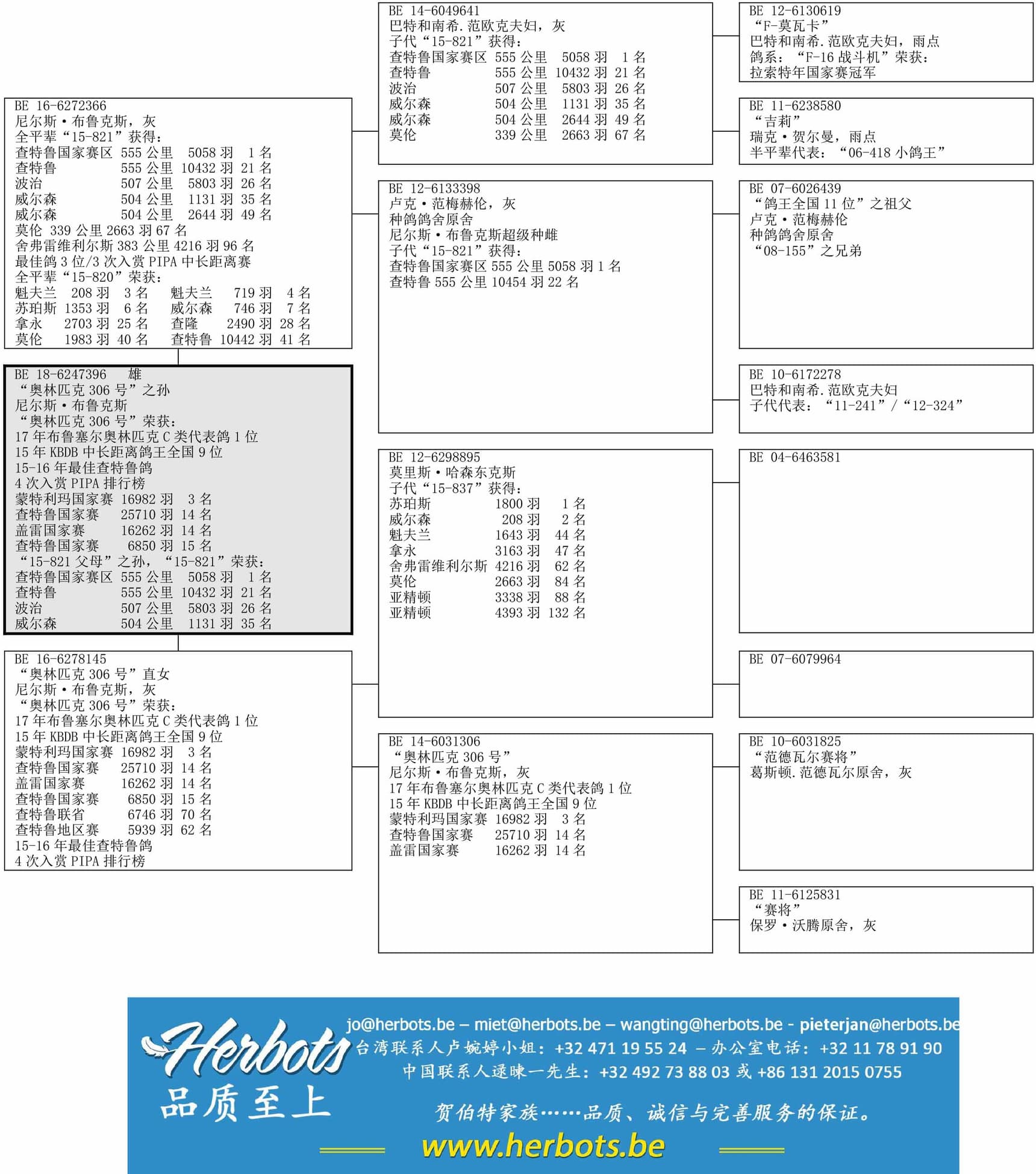 父亲:查特鲁国家赛区冠军之全兄弟”全平辈获得:查特鲁国家赛区 5058羽 1名查特鲁国家赛 10454羽 22名母亲:“奥林匹克306号直女”“奥林匹克306号”荣获:17年布达佩斯奥林匹克C类代表鸽1位