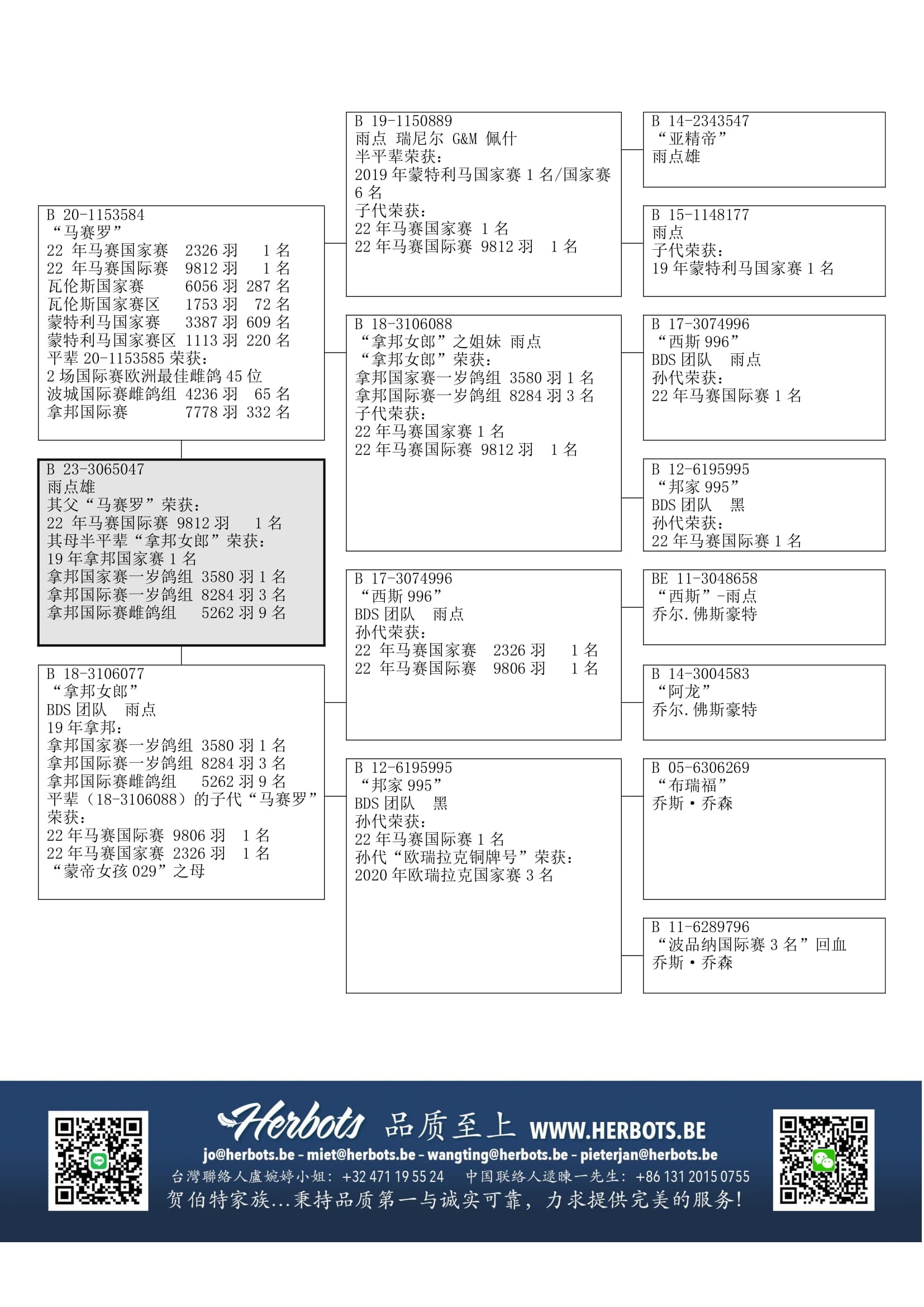 “B19-1150889” (半平辈荣获:蒙特利马国家赛1名 - 瑞尼尔 G. & M.原舍 ) x “拿邦女郎之姐妹” (平辈荣获:拿邦国家赛1名/国际赛 8,284羽3名)作出
