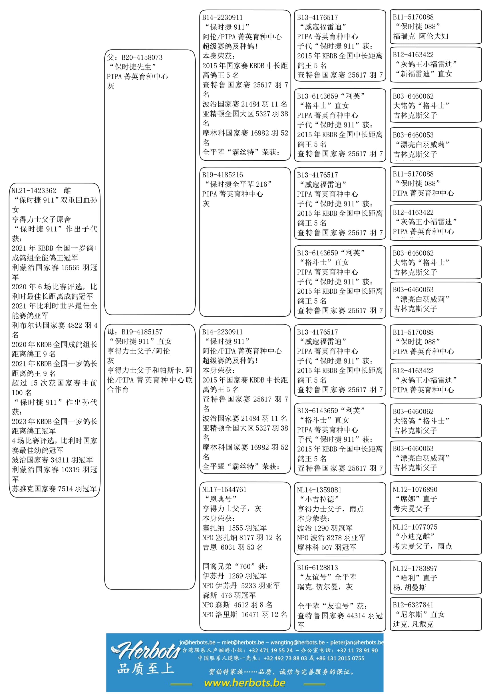 2023年KBDB全国一岁鸽长距离鸽王冠军-4场比赛评选,比利时国家赛最佳幼鸽冠军-波治国家赛34311羽冠军-利蒙治国家赛10319羽冠军-苏雅克国家赛7514羽冠军-苏雅克国家赛4827羽冠军-苏雅克国家赛4476羽冠军-利布尔讷国家赛3880羽冠军-2022年奥林匹克I类鸽王亚军-苏雅克国家赛6085羽亚军-2021年KBDB全国成鸽组长距离鸽王季军-利蒙治国家赛一岁鸽组8970羽季军-2023年KBDB全国幼鸽组中长距离鸽王4名-2020年KBDB全国一岁鸽组长距离鸽王5名-2018年KBDB全国一岁鸽组中长距离鸽王7名,等等优异赛绩