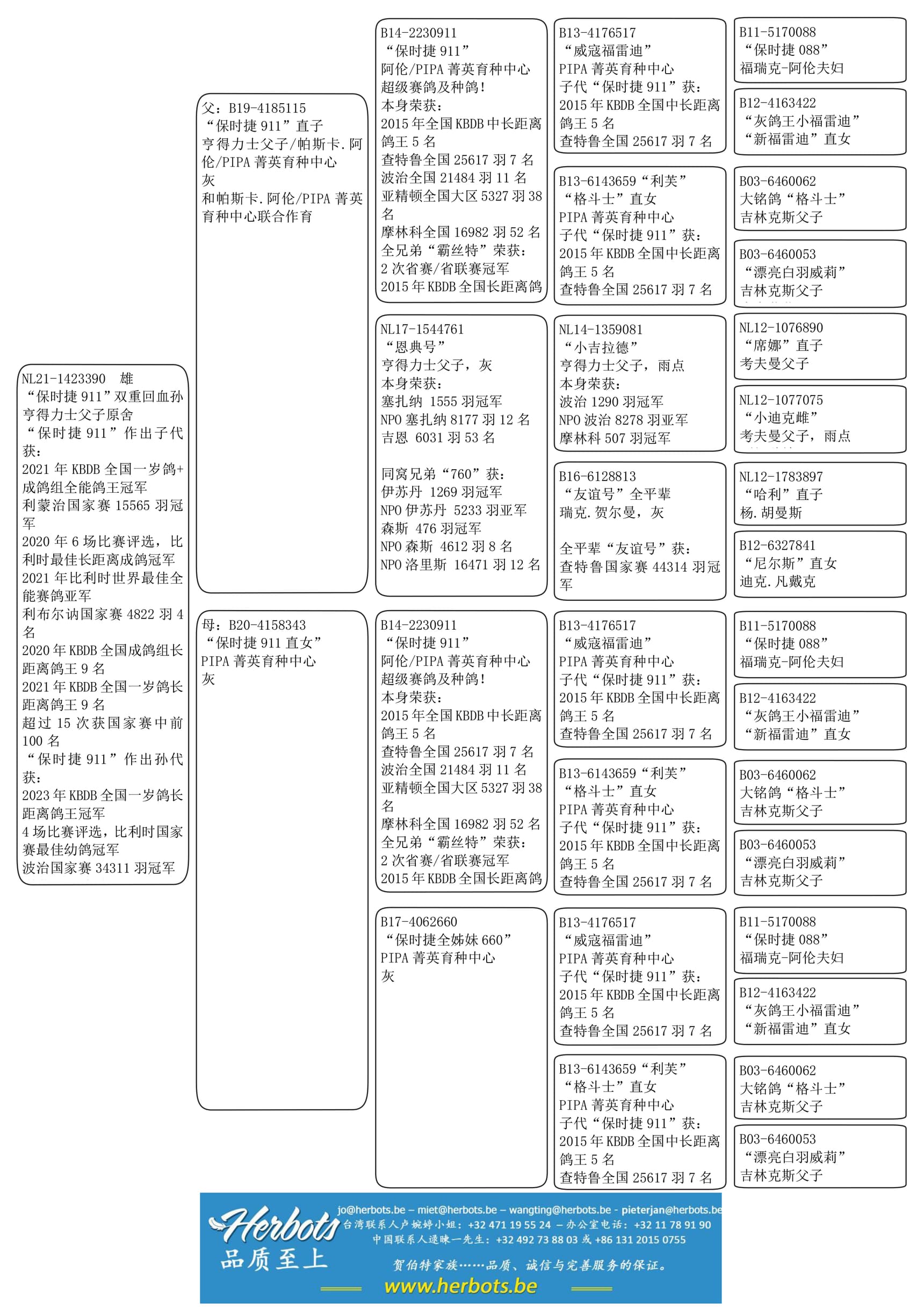 2023年KBDB全国一岁鸽长距离鸽王冠军-4场比赛评选,比利时国家赛最佳幼鸽冠军-波治国家赛34311羽冠军-利蒙治国家赛10319羽冠军-苏雅克国家赛7514羽冠军-苏雅克国家赛4827羽冠军-苏雅克国家赛4476羽冠军-利布尔讷国家赛3880羽冠军-2022年奥林匹克I类鸽王亚军-苏雅克国家赛6085羽亚军-2021年KBDB全国成鸽组长距离鸽王季军-利蒙治国家赛一岁鸽组8970羽季军-2023年KBDB全国幼鸽组中长距离鸽王4名-2020年KBDB全国一岁鸽组长距离鸽王5名-2018年KBDB全国一岁鸽组中长距离鸽王7名,等等优异赛绩