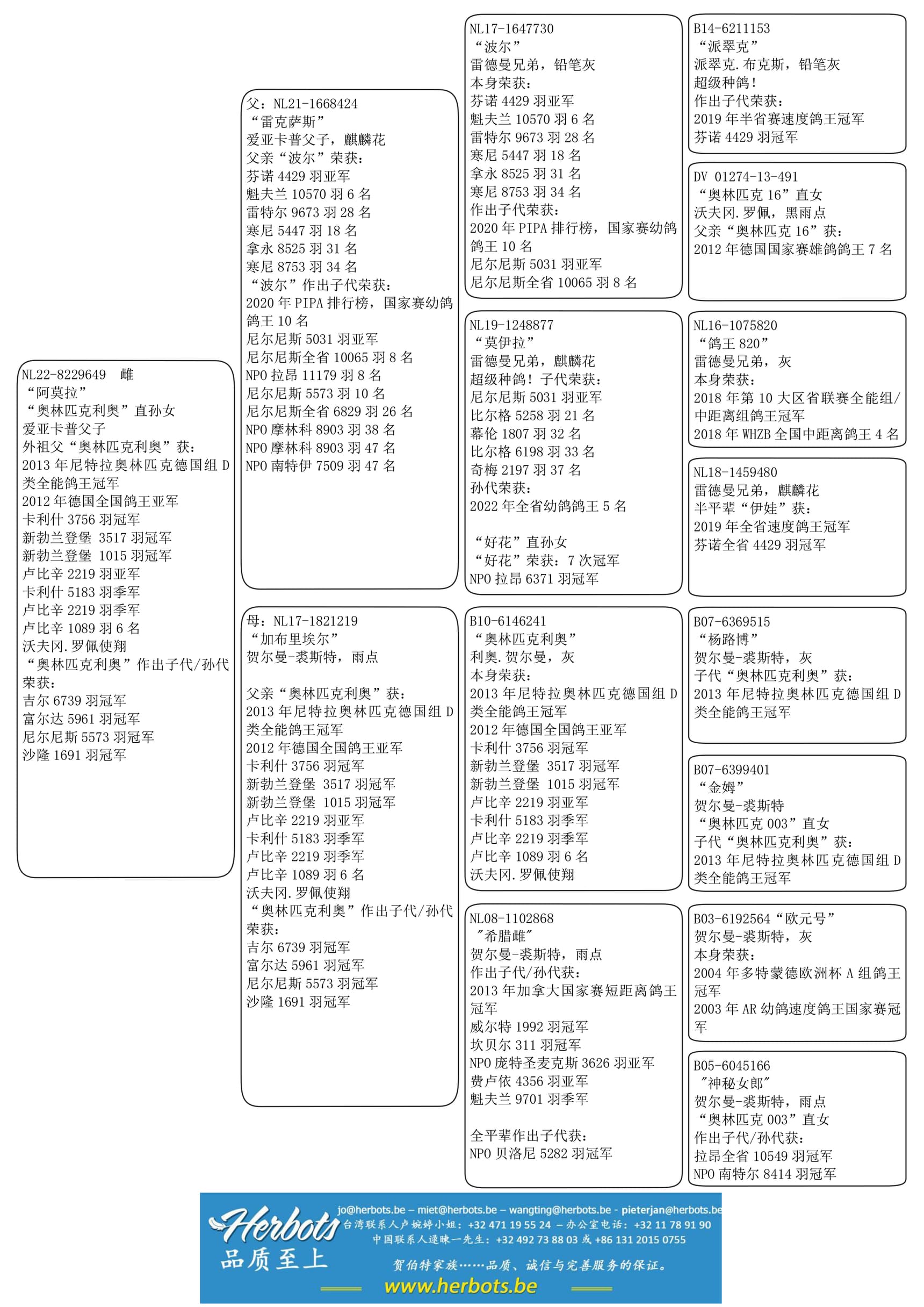 S8全省短距离鸽王冠军-S8全省成鸽鸽王冠军-2021年英国“泰坦游戏”半国家赛幼鸽组冠军-“黄金海岸50000”国际公棚综合鸽王冠军-非洲大特比冠军-沙勒维尔13310羽冠军-迪兹9131羽冠军-吉尔6739羽冠军-富尔达5961羽冠军-尼尔尼斯5573羽冠军-尼尔尼斯3345羽冠军-凯奇凯梅特3039羽冠军-纳文2509羽冠军-塔拉莫尔1934羽冠军-锡塔德1892羽冠军-尼尔尼斯1224羽冠军,等等优异赛绩