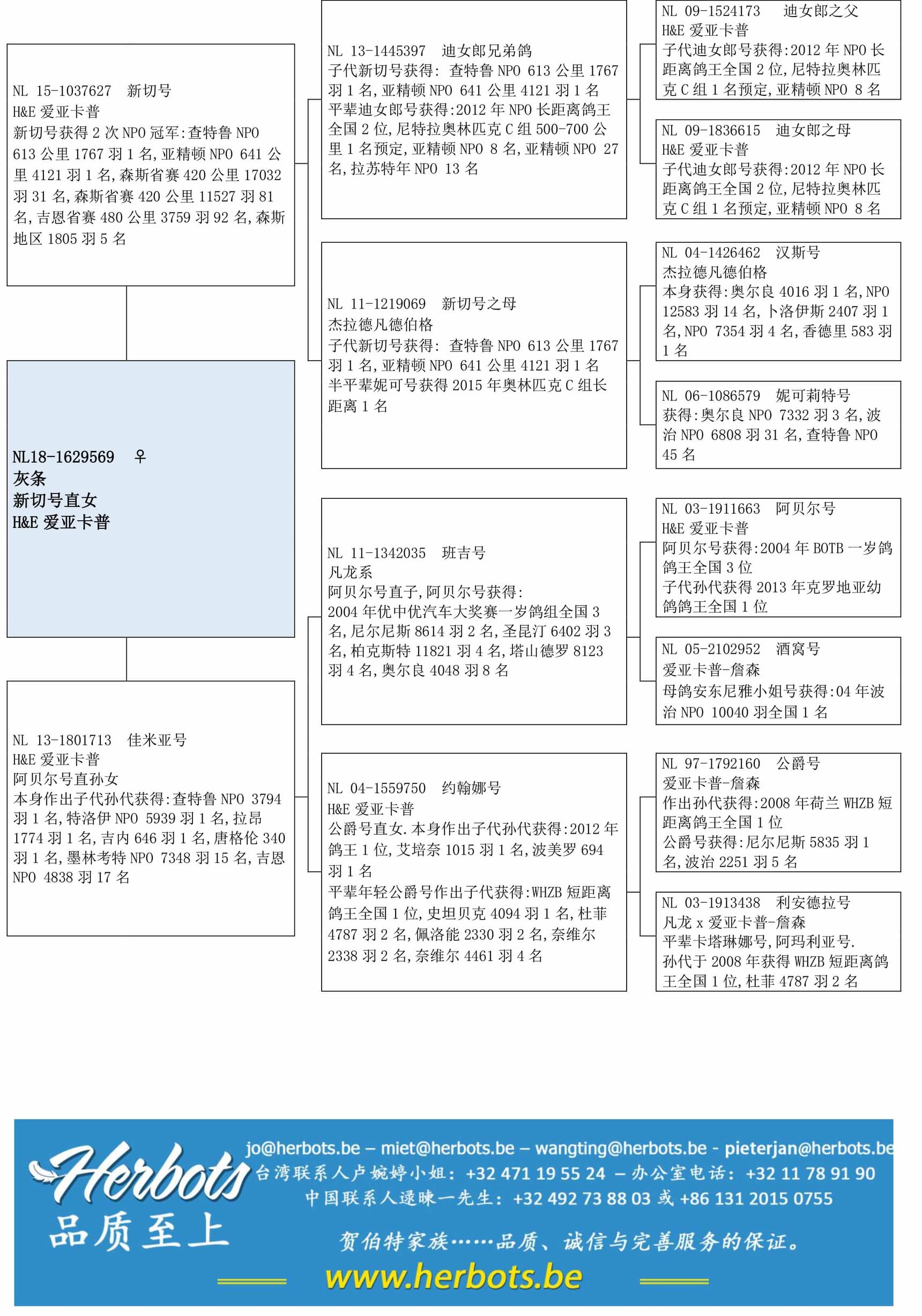 同父半姊妹:“香格里拉” 获得:2019年短距离幼鸽鸽王省赛2位“玛利欧” 获得: 尼尔尼斯 2,748羽 6名比吉斯 1,321羽 10名查隆 3,088羽 35名苏西松 4,763羽 40名威尔森NPO 3,397羽 41名吉尔 4,998羽 44名