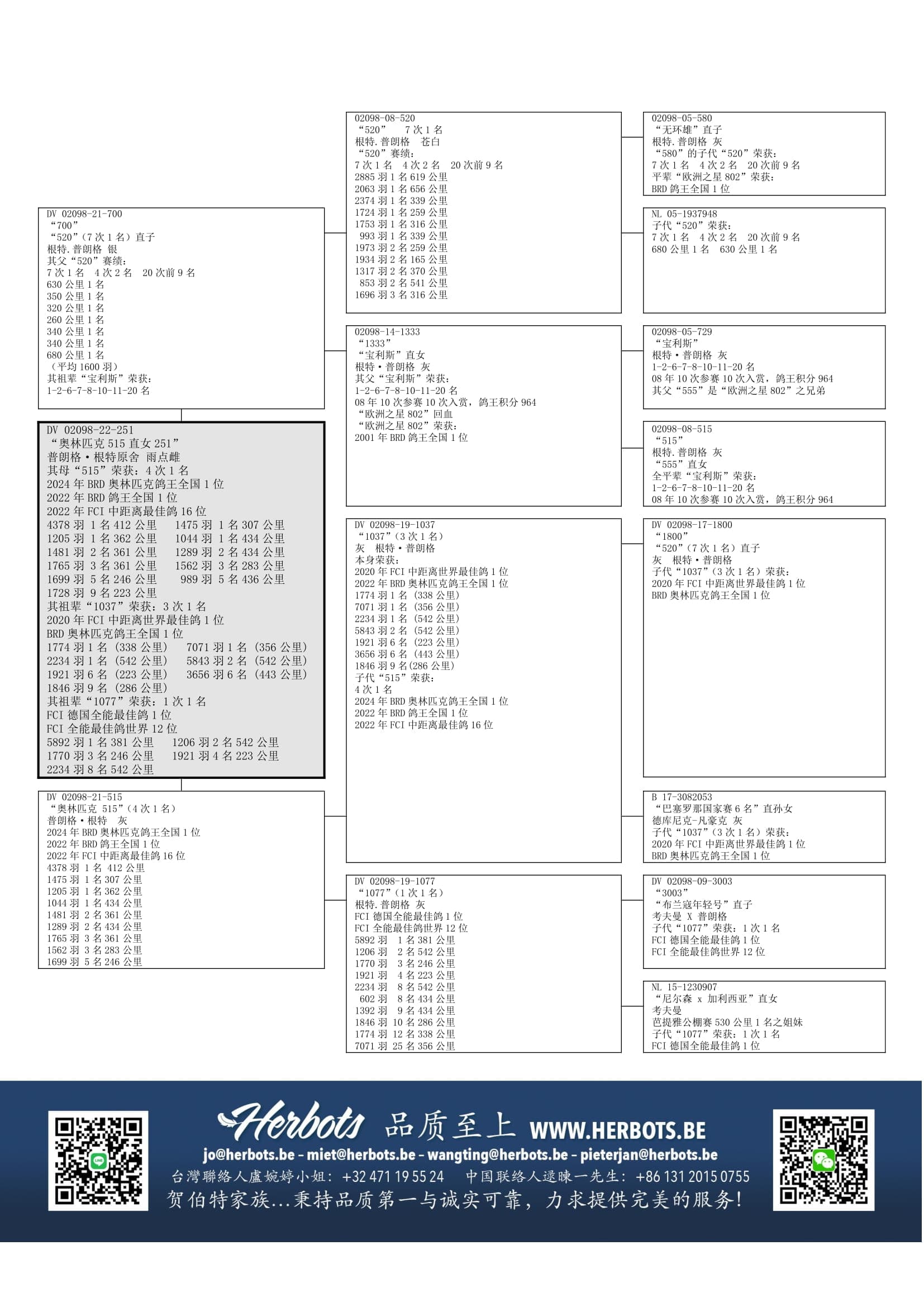 “1037” (2020年中距离世界最佳鸽1位 - 2022年奥林匹克代表鸽 – 1,774羽1名 – 7,071羽1名 – 2,234羽1名- 是2024年NPO鸽王全国2位之祖父 ,舒瓦特 G.使翔) x “1077” (FCI 德国全能最佳鸽1位 – 5,892羽1名- 1,206羽2名 – 1,770羽3名 –1,921羽4名 – 2,234羽8名 - 602羽8名 – 1,392羽9名 – 1,846羽10名 – 等等)作出