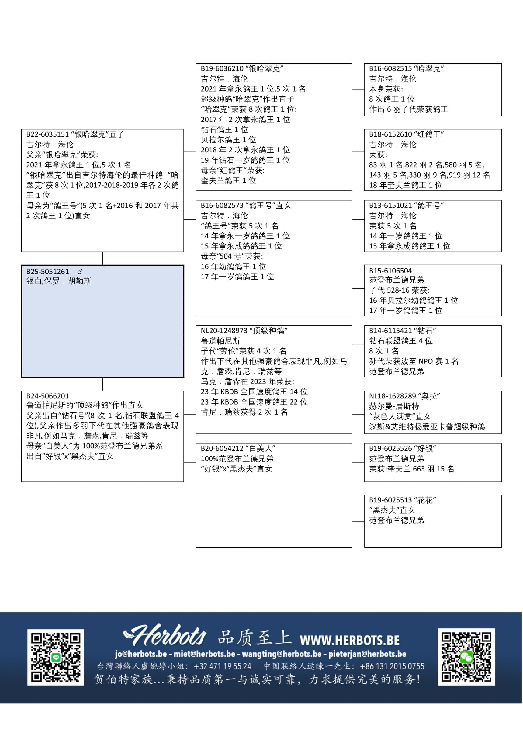 出自“哈翠克” (荣获8 次鸽王1位并作出6羽不同子代荣获鸽王)