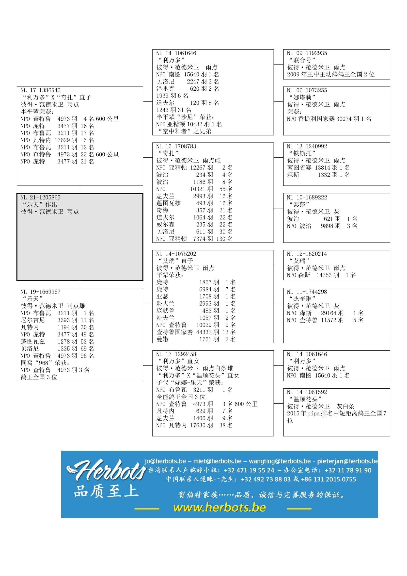 “利万多” (NPO 南图 15,640羽1名– 贝洛尼省赛 27,000羽1名) x “温顺花头”(15年鸽王全国7位) 直孙女