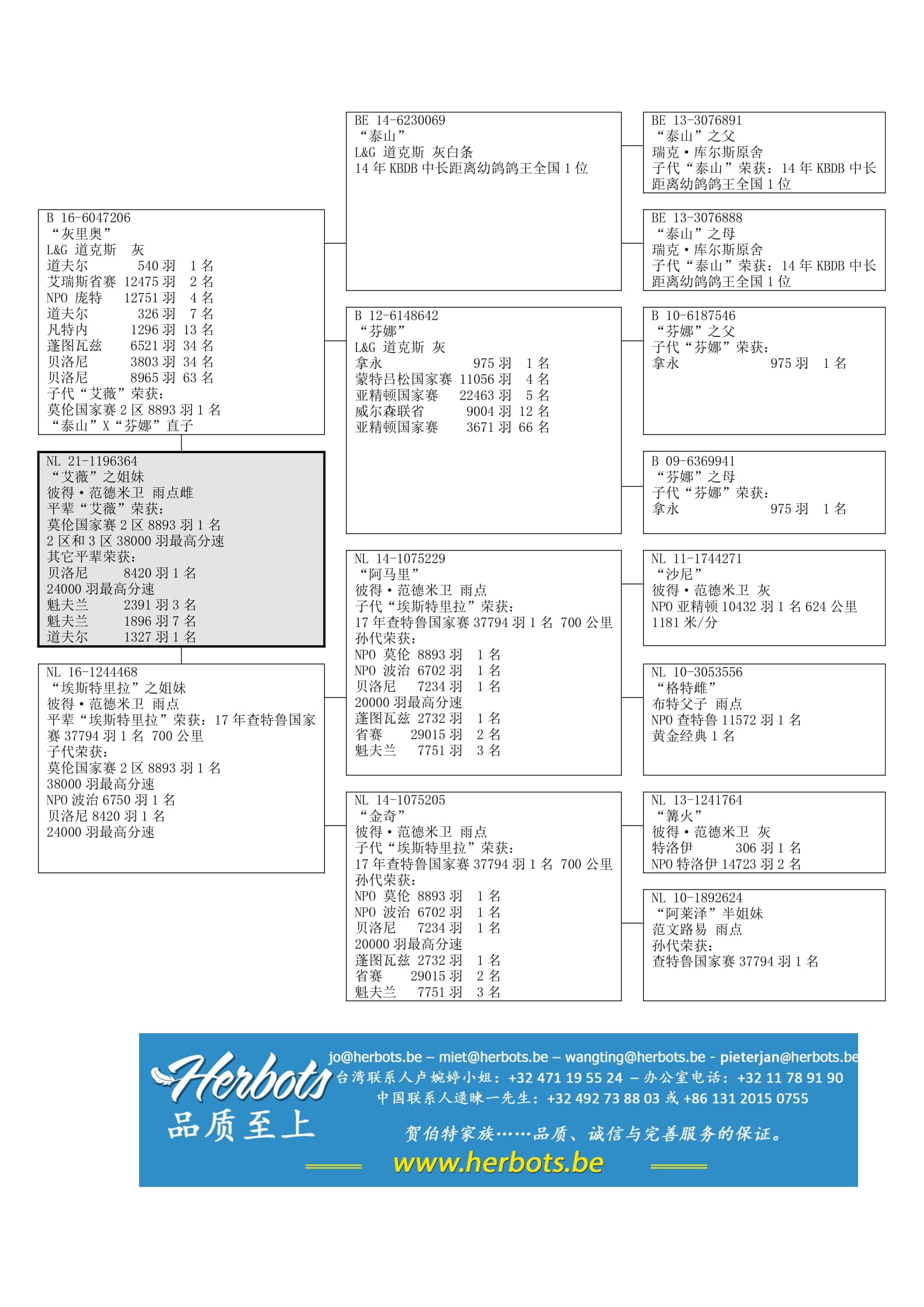 荣获: 道夫尔 540羽1名- 艾瑞斯省赛 12,475羽2名 – NPO 庞特 12,751羽4名 等等…